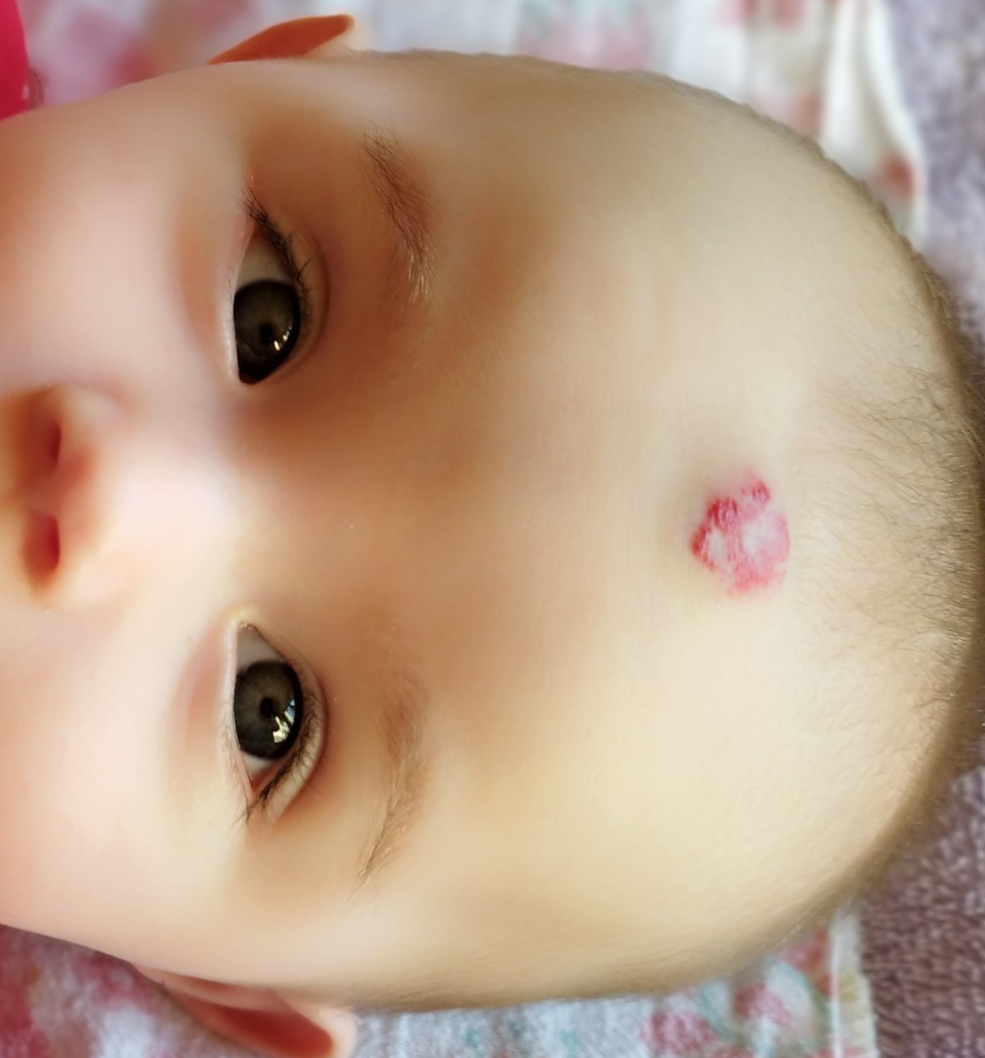 Преди да се надуе педиатърката предписва Пропранолол 3%, каза че ще мажем и ако не расте не е притеснително.  Взе да расте и ни изпрати в София, а аз избрах доц. Казанджиева, която предписа сироп Хемангиол, а докато чакаме документите за него мажем с Тимолол 1%. Има на места вече цвят на кожа, но все още е надут. Вече ме питат къде се е ударил, а той понякога с ръчички скубва косата точно дам или пък предрасква с пръсти точно там и ме е страх да не го разкърви. От друга майка знам, че трудно се спира кръвта, а в спешното в Бургас не знаят как да го направят.