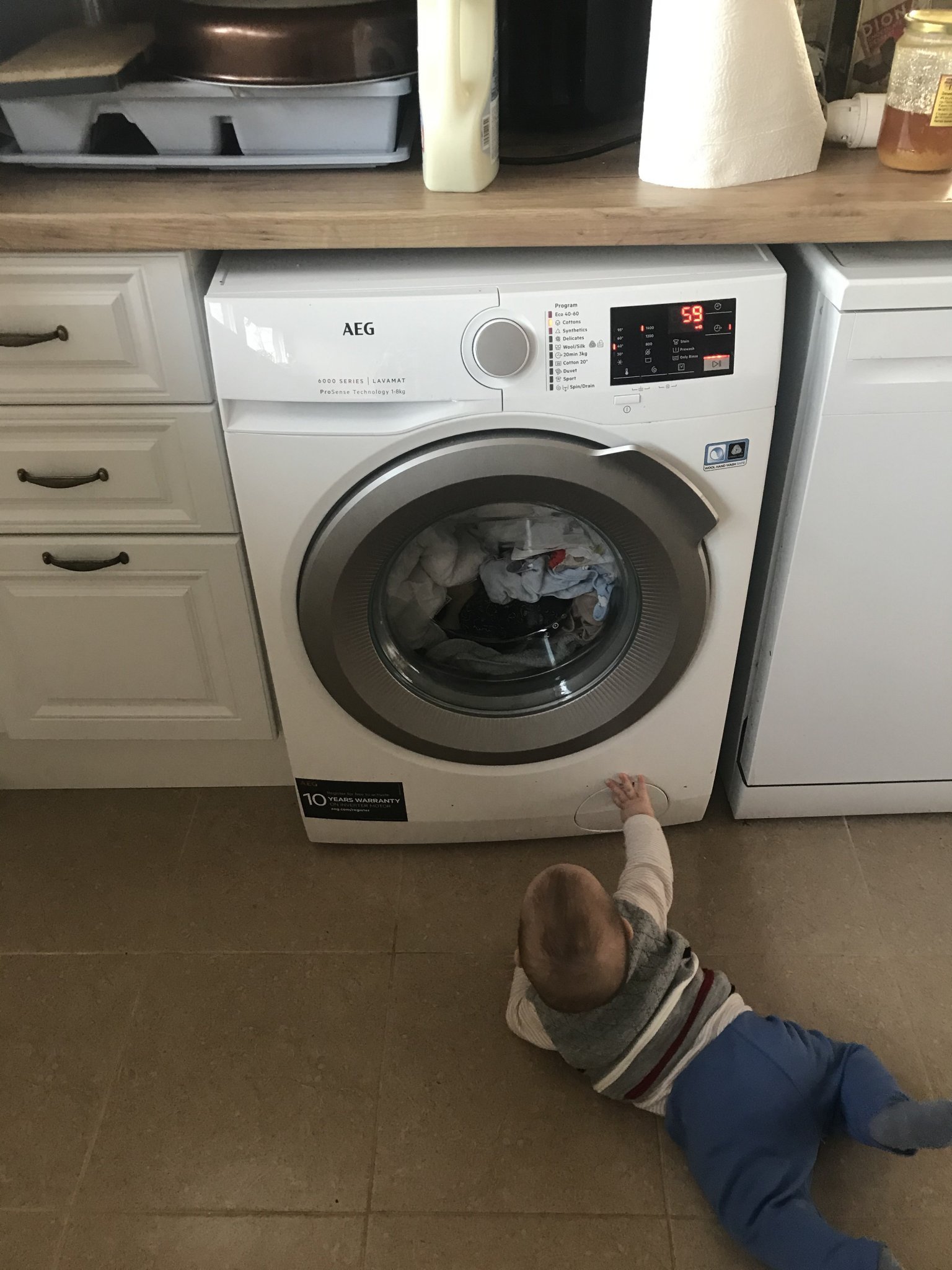 Вчера го оставих в шезлонга да гледа пералнята и го видях, че вече си лапа крачетата. Та официално ги откри. Даже докато го кърмя ги вдига и си дърпа чорапите.