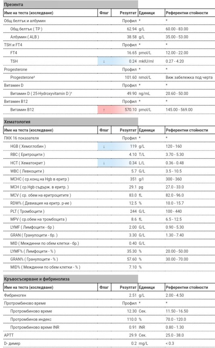 И аз пусках изследвания скоро. Притеснява ме ниския хемоглобин (нормално ми е около 135) и ще трябва да вземаме мерки отсега... Че по-нататък ще пада още