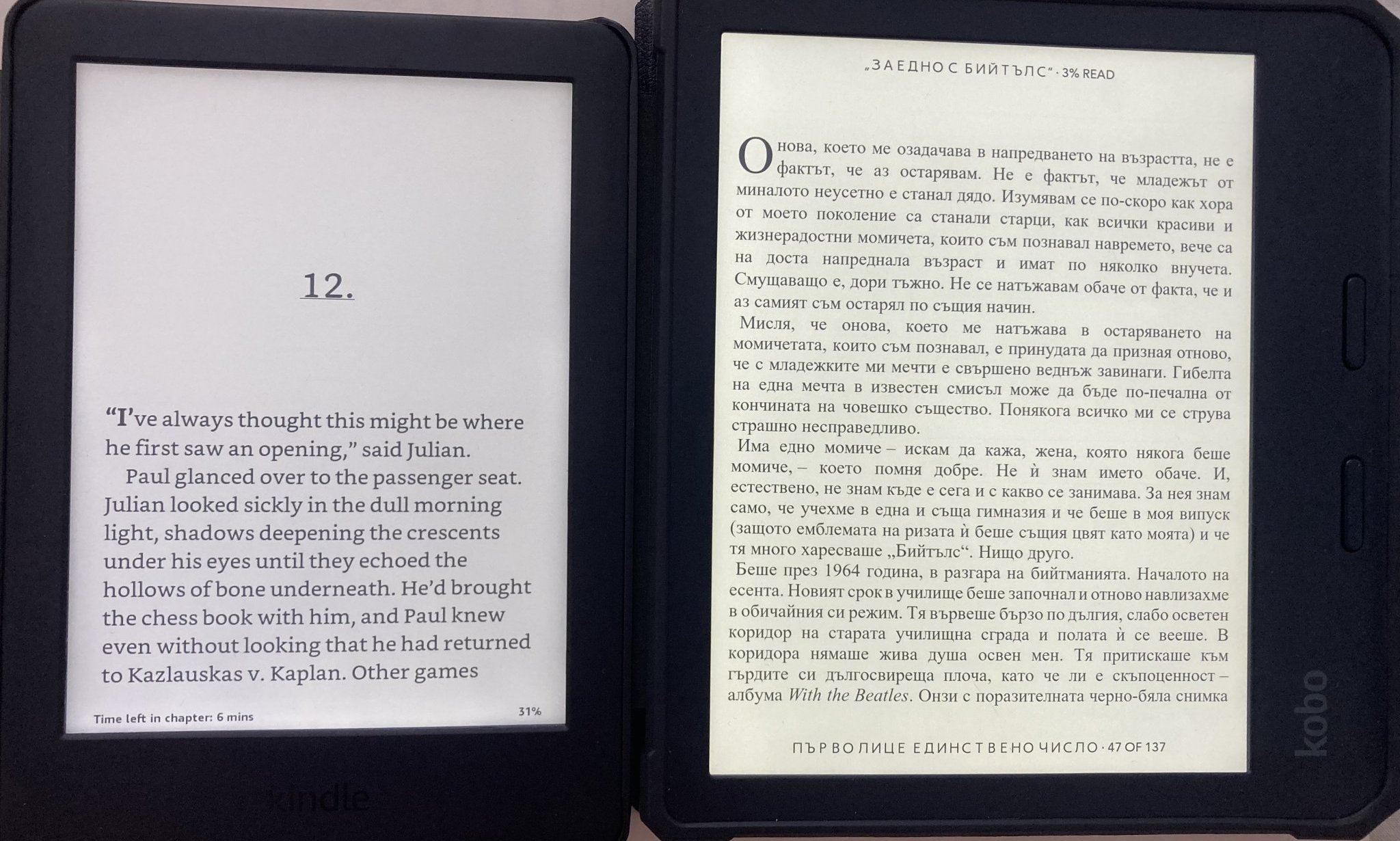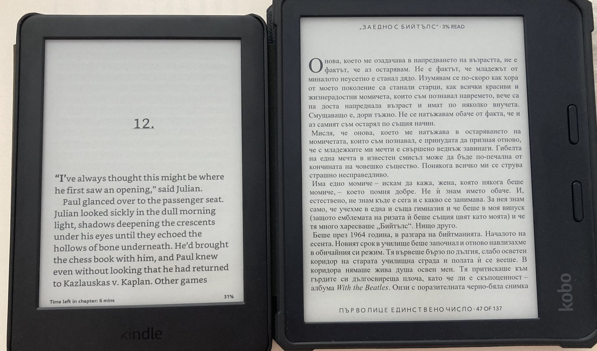Поне за мен основното предимство на Кобо-то е това, че чете директно книги в epub, fb2 и т.н., а не е ограничен само до AZW3 и mobi. За новия модел пишат, че има още по-добър контраст на страницата - бялото е още по-бяло, а черното - по-черно. Иначе и Кобо-то и Киндълът са прекрасни четци. Всичко е въпрос на лични предпочитания.