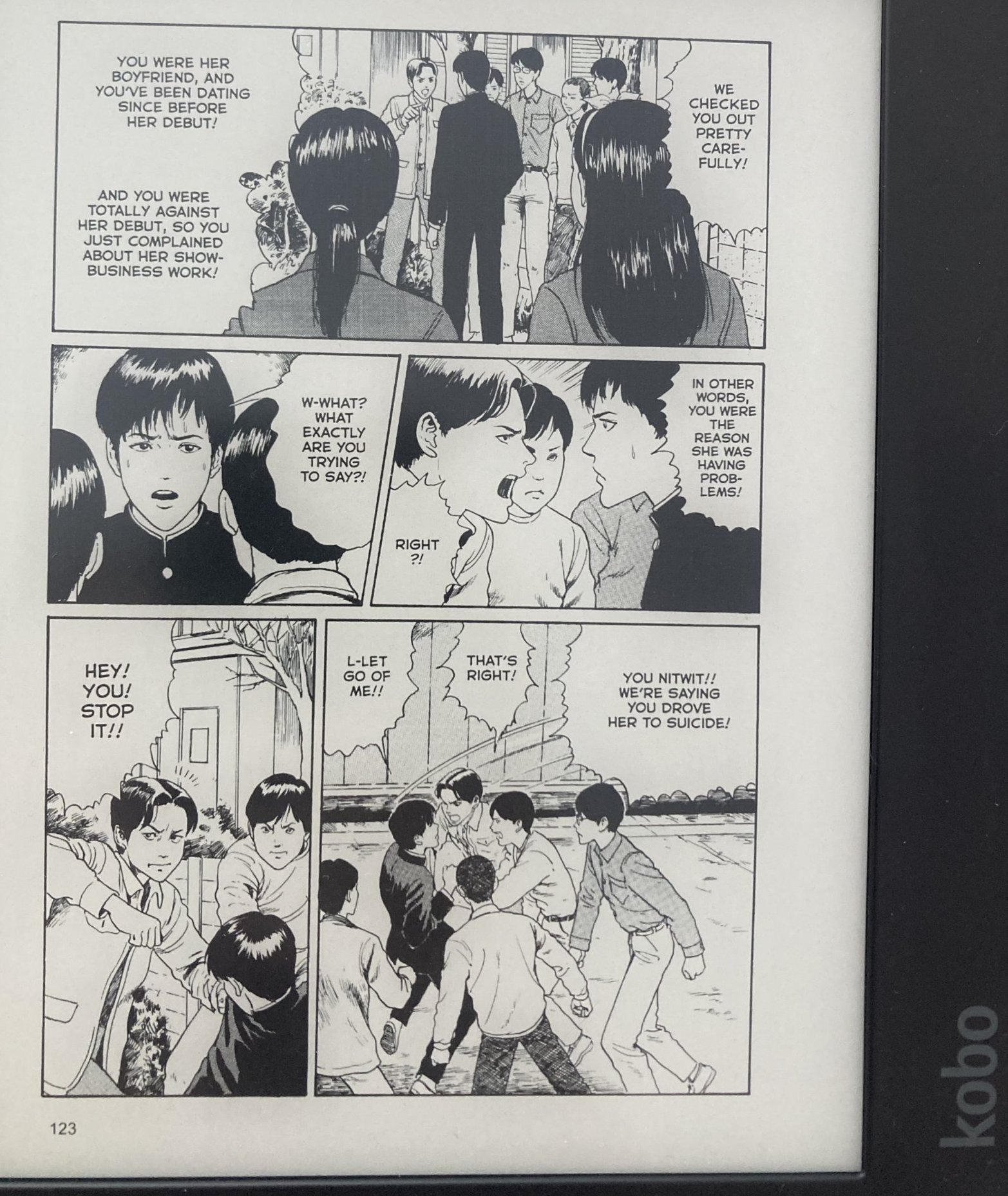Споделям няколко снимки на Kobo Libra 2 и Kindle 2019 (знам, че са доста различни, но за да се ориентирате поне мъничко как изглежда екранът). Според мен Kindle PW5 е по-добър за четене на манга и графични романи, а и е по-бърз от Kobo Libra 2.