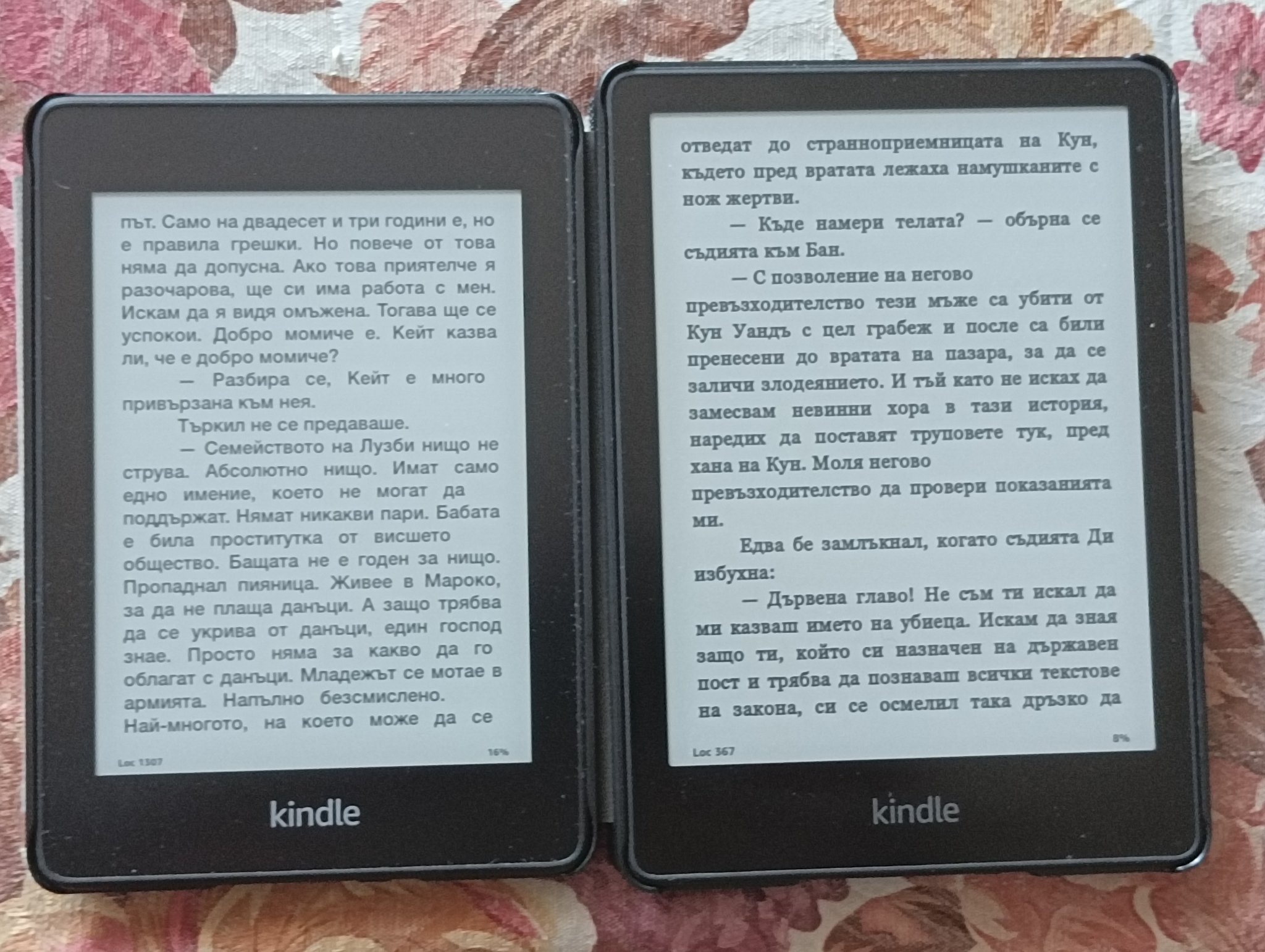 От снимката е. Освен това двата са с различен шрифт. На 6.8 инчовия книгата е с шрифт Georgia, качен допълнително, а на 6 инчовия - с вградения шрифт Helvetica или нещо подобно. Иначе и двата са Paperwhite модели - 2014 и 2021.