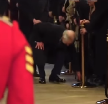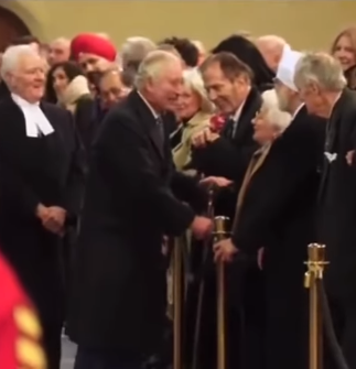 Чарлз на откриването на паметна плоча, която отбелязва къде е положена Елизабет II. Имаше кратко видео, където се навежда и вдига един паднал бастун и го подава.