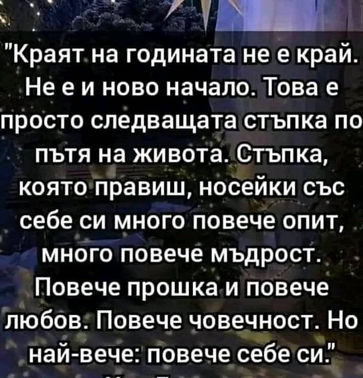 Изпращам поредната година изсипала върху ми  болки, разочарования и малко радости…След всички преживени  години вече знам, че човек може всякак да живее. Може с всичко, може с всеки, а ако се налага може и без всичко и без всеки... Такава е суровата истина... Има моменти, през които ти се струва, че не можеш да преминеш, но те отминават, ти преминаваш, но не си вече така цял и не си точно същия човек… От Новата искам само да е здрава и НОРМАЛНА. Интересуват ме простите неща - като да прегърнеш някого, като това сърдечно да му залепиш влажна целувка на бузата, да му кажеш от един дъх разстояние, че го обичаш, да можеш да седнеш в любимо заведение, с някого на педя разстояние от теб.