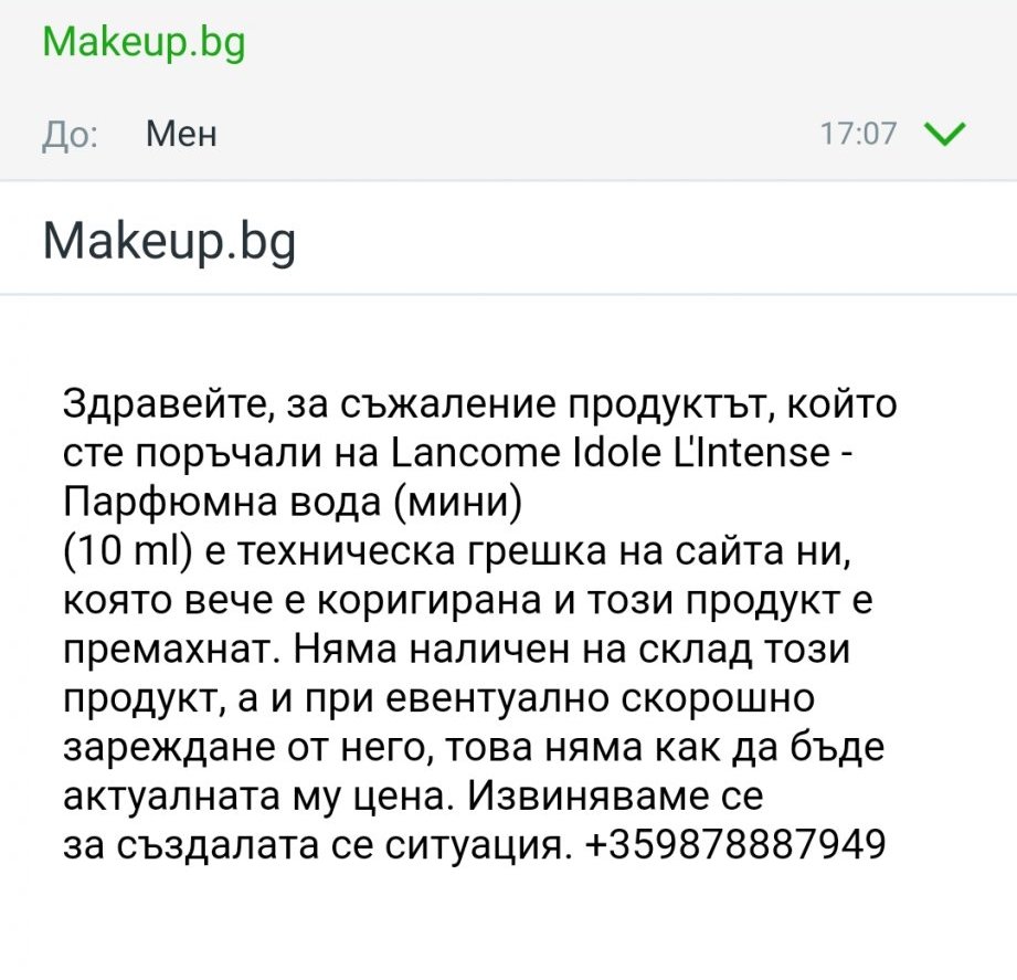 Очаквано и моята поръчка на Idole L'Intense е отказана от MAKEUP.