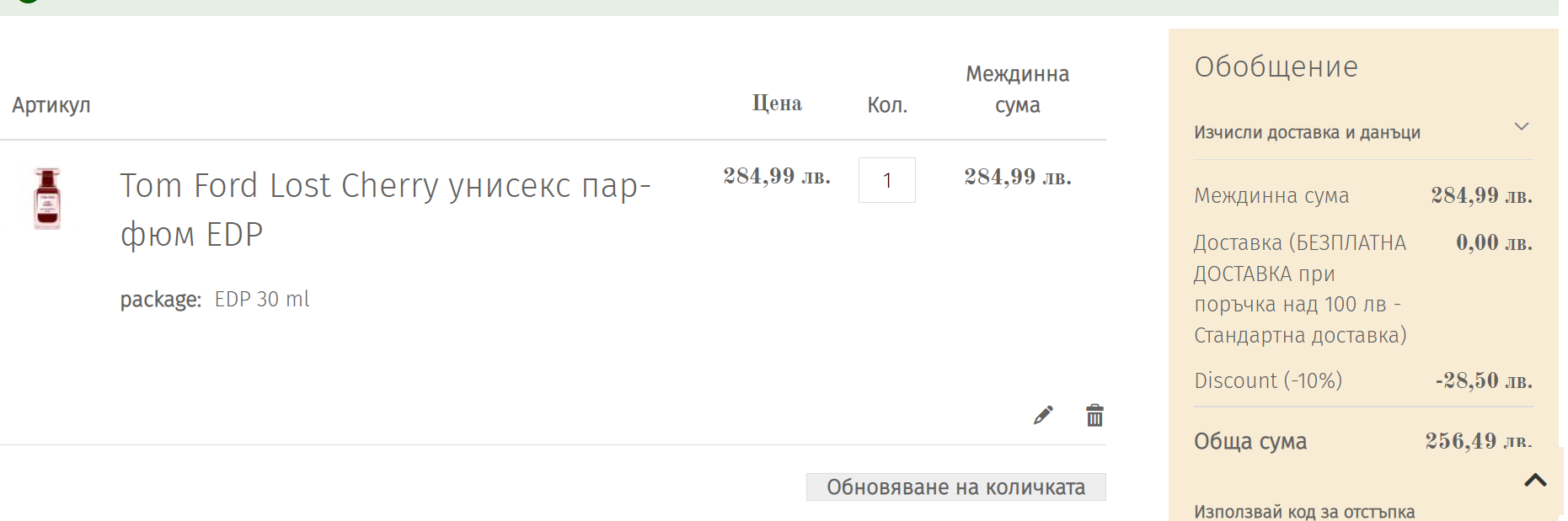 Току ще поръчах един Шанел 5, 35 мл. от Парфюми шоп. С код Dec22 стана 112,23 лв . А уж нямаше повече да купувам..