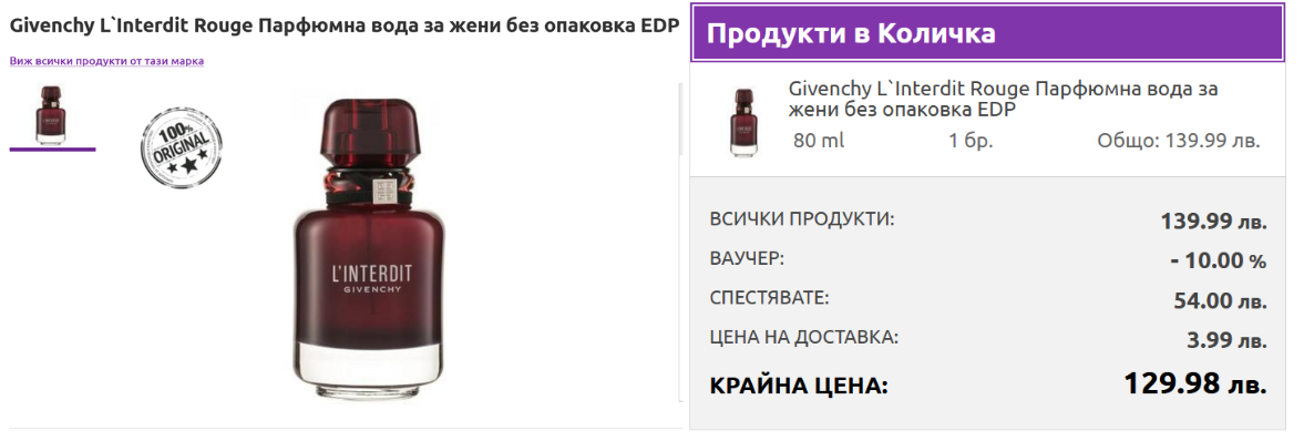 При мен Lancôme idol intense 10ml. е в списък любими и от там добавям в кошницата. Все още излизат 2 броя налични. Цената е 24,52лв.