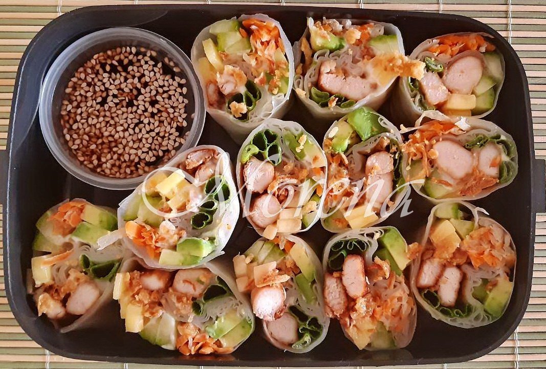 Идея за готвене (от азиатската седмица Simple Smile ) - Оризови ("пролетни") рулца с мариновано пилешко, манго, авокадо и зеленчуци, пържен лук и майонеза с домашен Понзу сос - уникално вкусна азиатска хапка!  Simple Smile