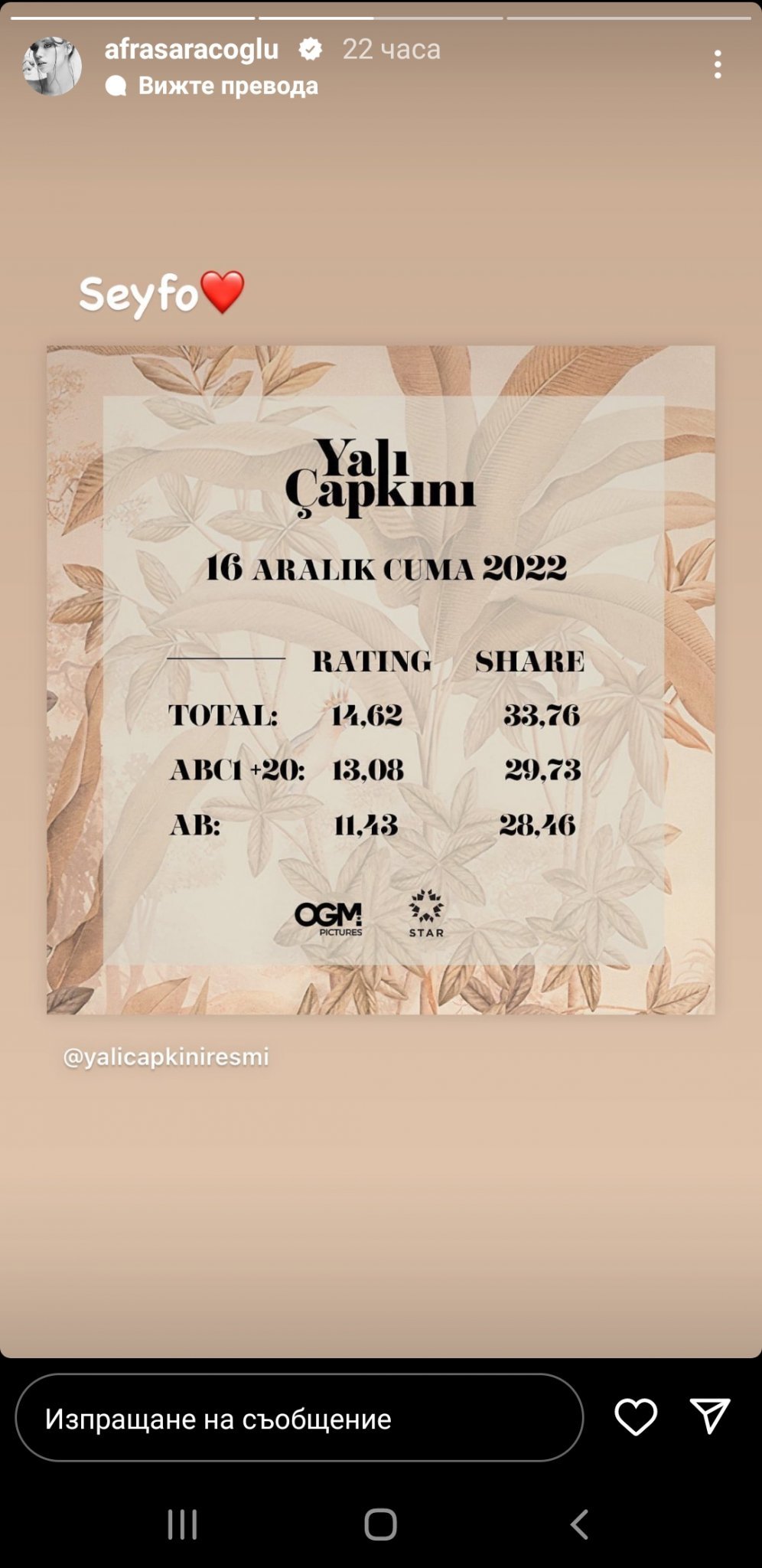 Нямам възможност да изгледам цялата серия, но успях да видя няколко сцени и едната от тях е тази от вилата на Пелин. Това момиче не обича себе си, как ще обича друг човек? Не знам какво е името на психичното й отклонение, защото нейното не е нормално. Ферит в прав текст й каза, че тя няма място в живота му, освен като кошче за душевни отпадъци, тя пак - “ама аз без теб не мога да живея”. Що за живот е нейното? И на Сейран каза - “върни го, аз без него не мога” 🤦  Ферит обясни много простичко всичко, ама то има ли отсреща кой да чуе… Лошото е, че в реала има такива жени. Това тяхното не е любов, а страшна обсесия…