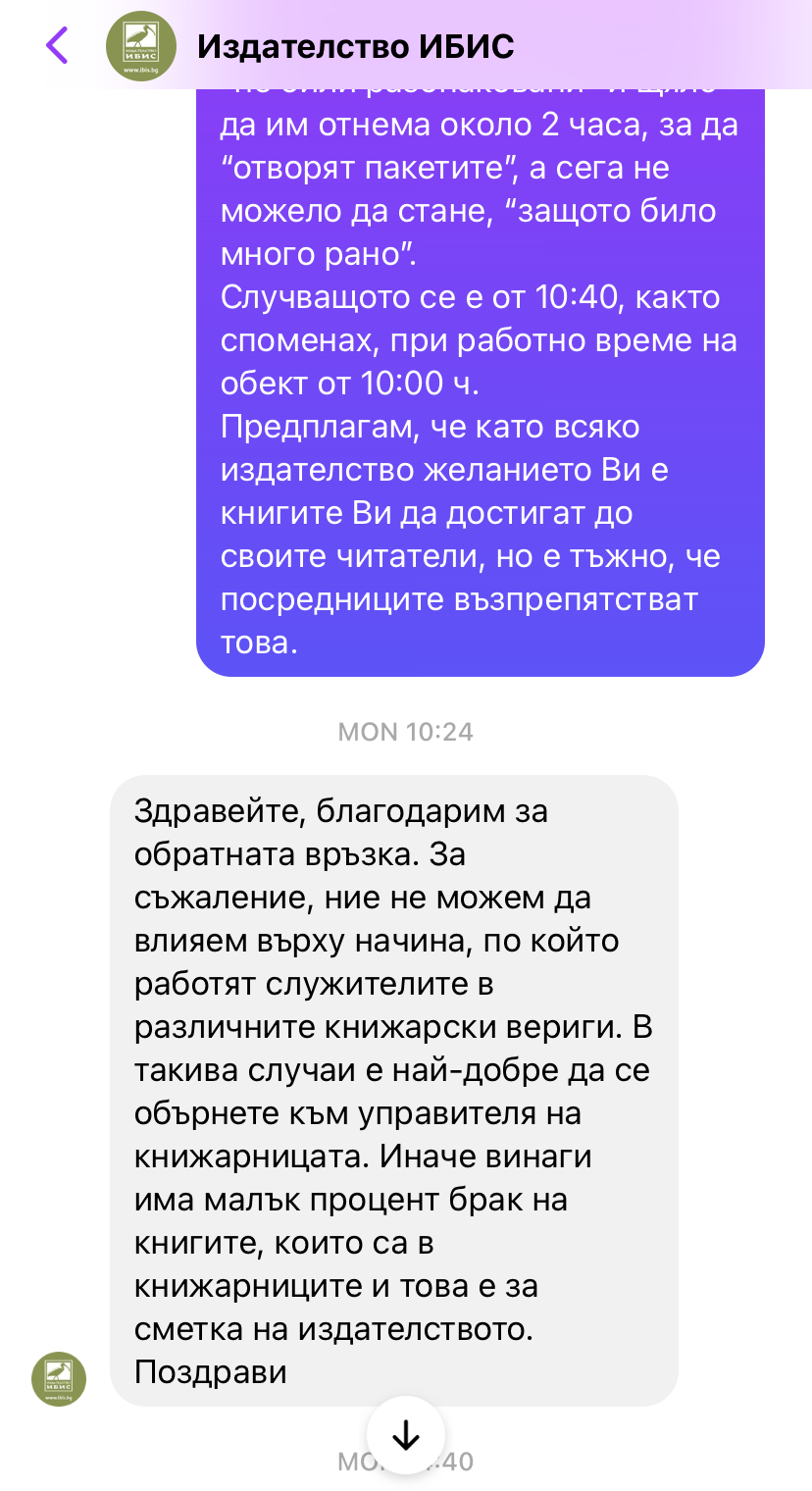 Eто тук отговор от издателството при описан проблем как в голяма физическа книжарница на 31.12 се оправдават, че единственият екземпляр, който могат да продадат на най-новата книга на издателството, е мръсен и съответно не в добър търговски вид. Още повече при условие, че в същото време от екипа на книжарницата потвърждават, че има още налични нови бройки, но не били “разопаковани”