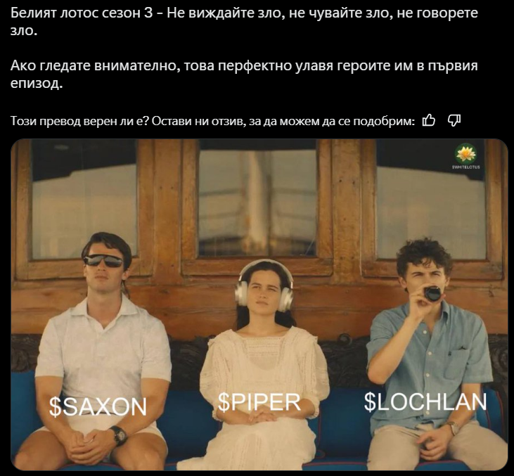 Потребителите на форума имат положително мнение за втория сезон на сериала "The White Lotus". Те отбелязват, че вторият сезон е много по-интересен от първия, със съспенс и брилянтен актьорски състав. Някои от тях споделят, че първият сезон не ги е увлякъл, докато вторият е съвсем различен и ги кара да се връщат и да гледат отново от началото, за да открият уликите и подсказките в думите и действията на главните герои.