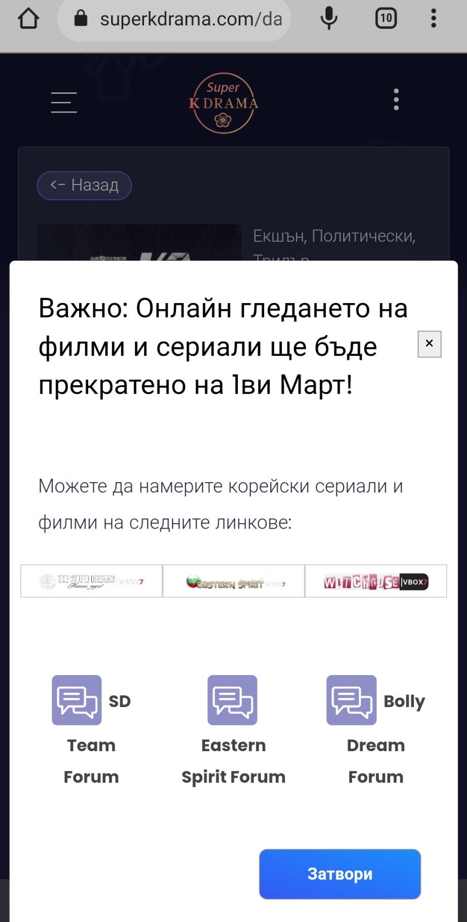 Крис, такова съдържание е точно по моята част, но ми излезе надпис преди видеото да се отвори че гледането на филми и сериали онлайн на 1.03. ще бъде преустановено. Какво е това сега, нещо във връзка с К- драмата или е друго?