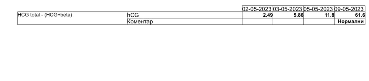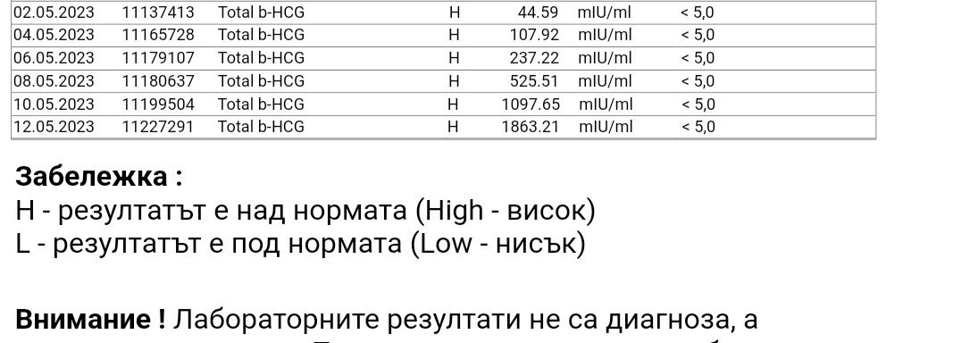 На 02.05 е първият тест , който е 11 ден след трансфер на едно 3 дневно ембрионче, следващите са през 2 дена - 48 часа. До вчера мисля, че нарастваше добре, за първи път не се удвои резултата. На 19 петък съм. На преглед при моят репродуктивен лекар, но до тогава ще се побърквам от мислене.