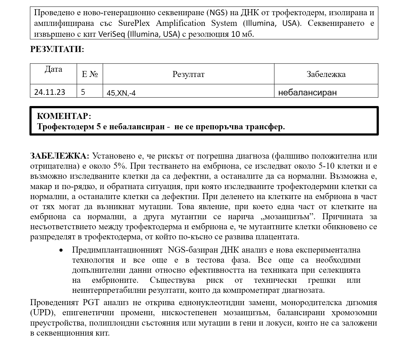 Здравейте , някой може ли да интерпретира този резултат от ПИД. Разбирам , че не е подходящ за трансфер, но  какво означава "45,XN,-4 "?