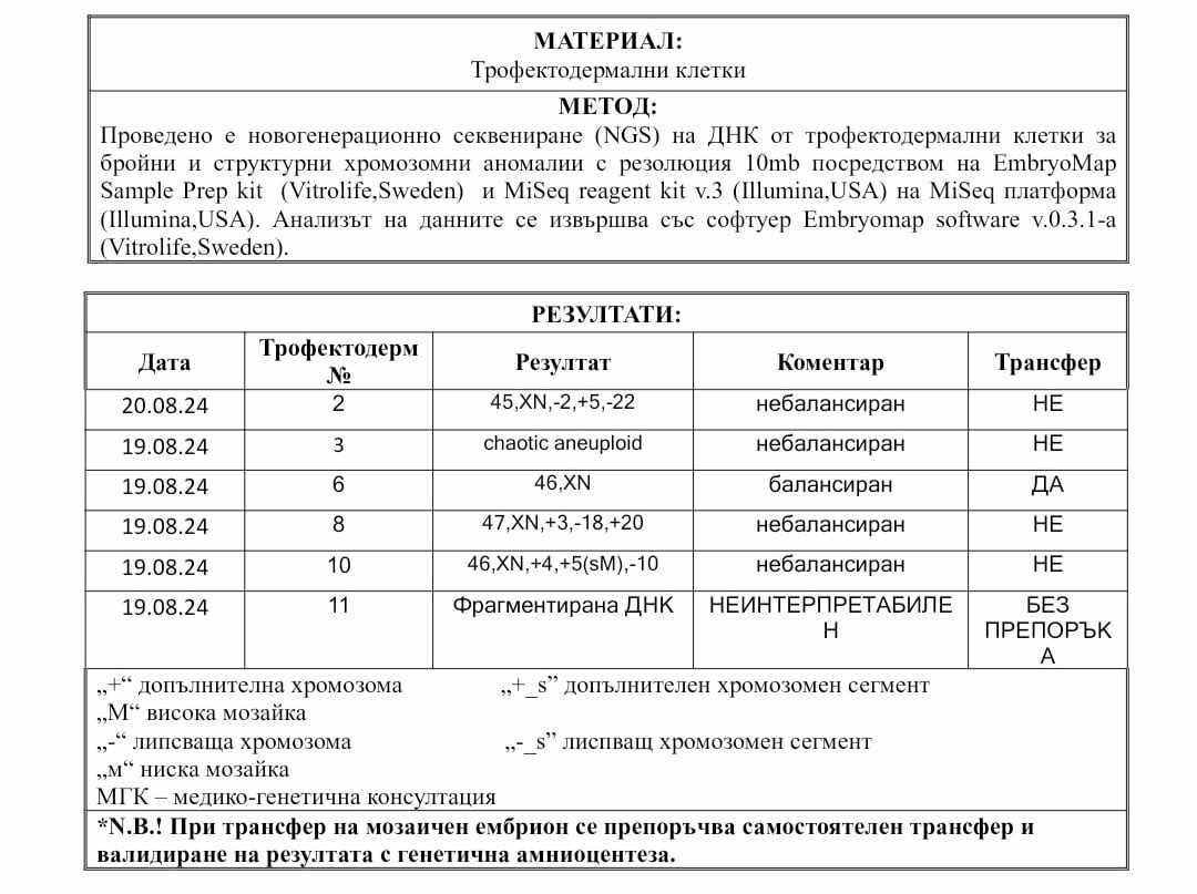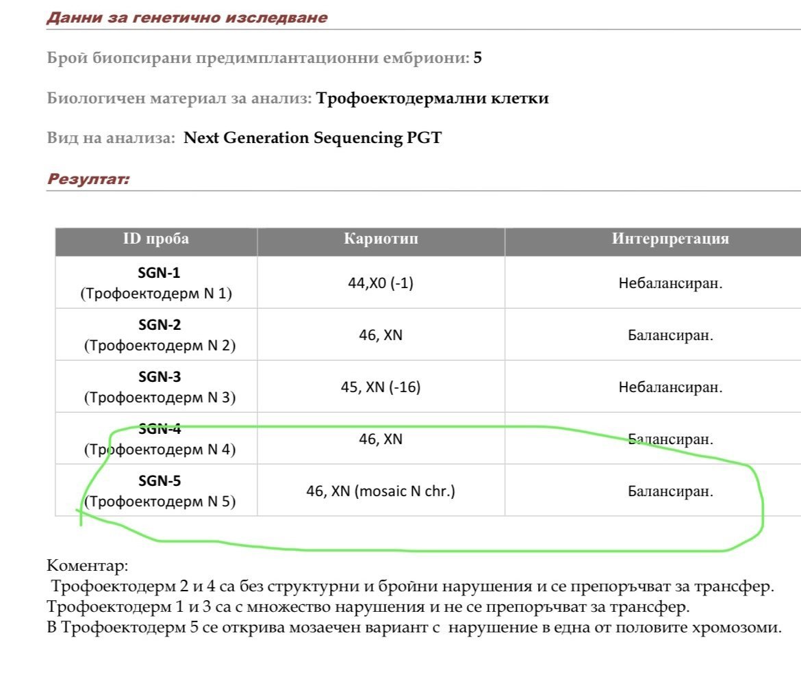 За съжаление повечето са небалансирани. Четох доста, но не съм сигурна, как се интерпретират резултатите. Някоя от вас би ли могла да коментира? Този, който са определили като балансиран, дали е добър? Разбирам, че 46 хромозоми е добре, но какво значи XN и трофектодерм 6? А небалансираният по-скоро няма шанс или може да се опита и с него? На 41 съм, яйцеклетките ми са събирани на 40 и не знам, дали са ми останали още някакви за събиране. Благодаря ви предварително!