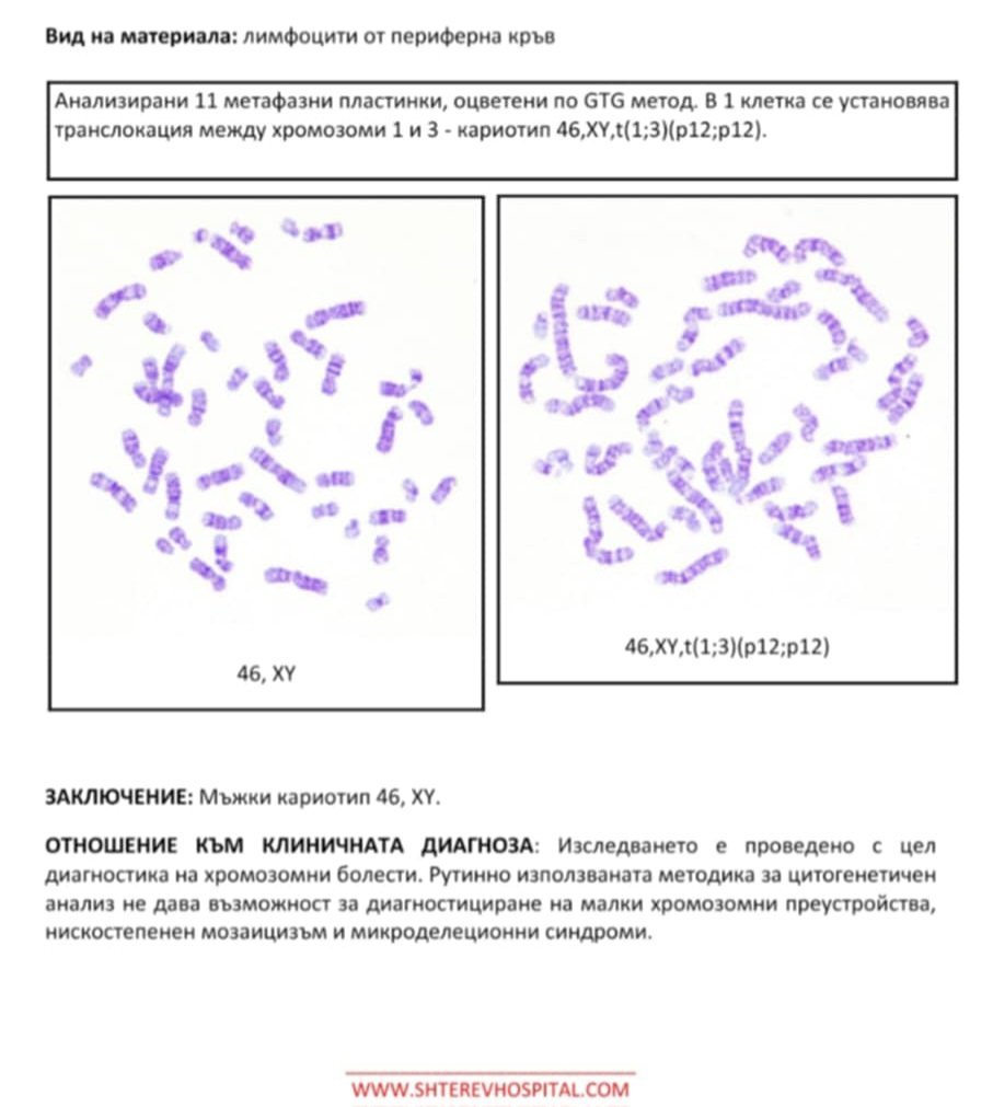 Здравейте, това което сте публикувала не е ПИД, а кариотипизиране, нали така? След оцветяването с g-banding са открили, че има пълен набор от 23 двойки хромозоми, тоест няма липса на генетичен материал, но между 1ва и 3та хромозома имат разменен участък в 12 зона на късото рамо на двете хромозоми, т.е. въпросната транслокация, за която пише в самия резултат. Тъй като няма промяна в количеството на генетичния материал предполагам, че човекът, който е носител на този генотип си е съвсем нормален фенотип, проблемът обаче е с половите клетки, които образува такъв генотип, защото по принцип всяка хромозома трябва да е хомоложна ( идентична) с другарчето си, но в случая се сформират две двойки, които заради разменените сегменти стават нехомоложни едни с други и при образуването на гамети, половите клетки, материалът се разпределя неправилно вече, и те, половите клетки са небалансирани в някакъв процент, по учебника ни около 50/50, ама нали ви е ясно, че това не е точно математика.