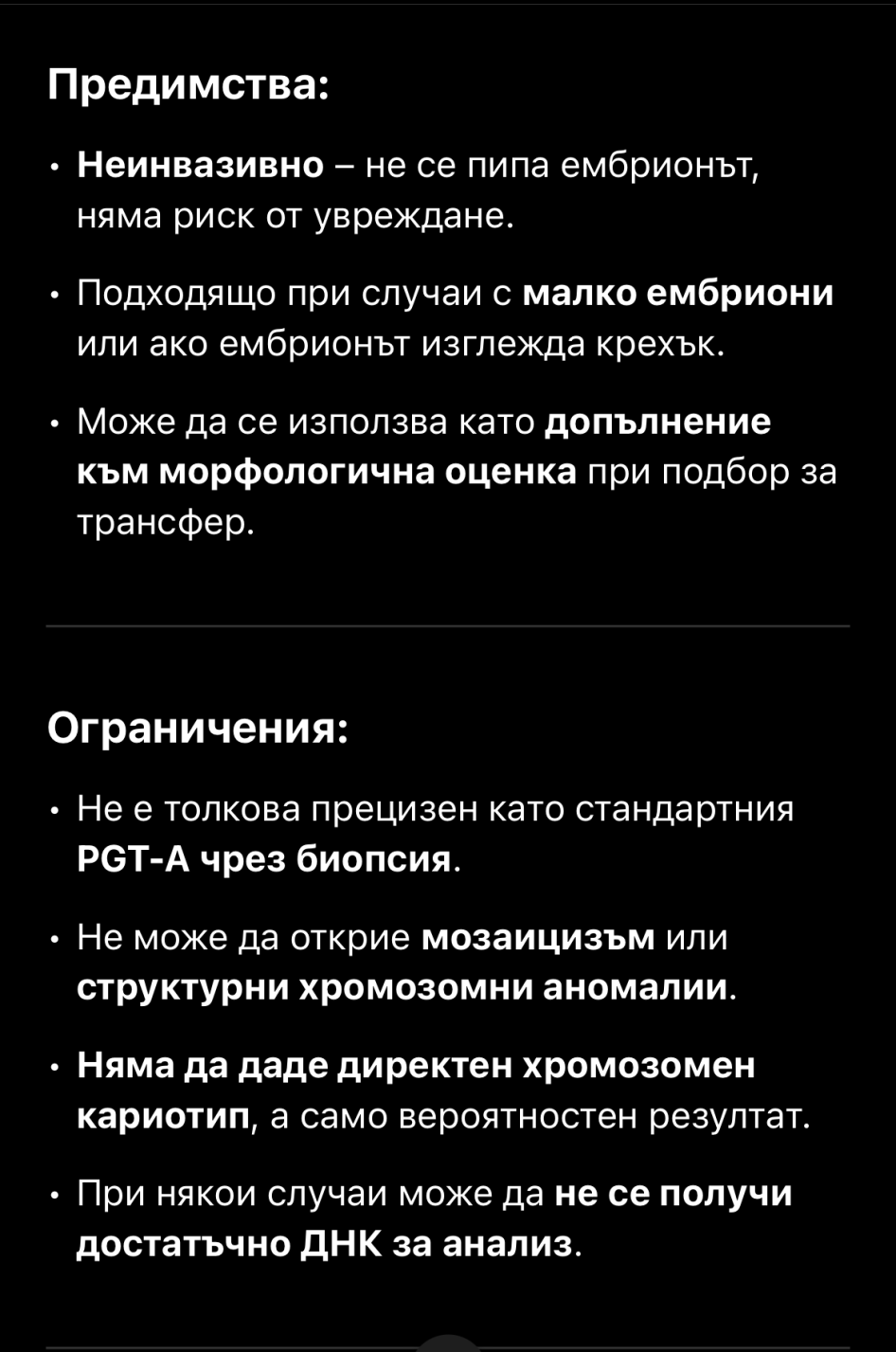 И аз днес разпитвах Chat GPT и останах с много съмнения. Малко по-късно ембриолозите ми обясниха коренно различни неща. Съвсем малко по-неточен бил от пид, носил си подробна информация за хромозомни аномалии с детайли, както и за мутации. Идвал с процентно заключение за потенциал и т.н. Затова реших да проверя за реален опит и къде е истината. Но ми прави впечатление, че никъде нищо няма споделено като опит. Действително отскоро е методът в България, но явно не се и ползва.