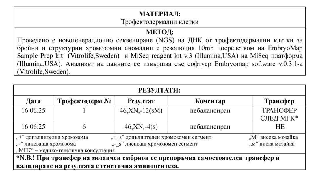 mar4e и двата ембриона са с правилен брой хромозоми (46). Първият е сегментна мозайка с монозомия в 12та хромозома, т.е. част от 12та хромозома липсва в една част от биопсираниете клетки на ембриона. Няма информация за конкретната част и от кое рамо липсва, както и процента на мозаицизъм. Би трябвало да е нещо такова "-12q12_q24.33" също поне дали е висока или ниска мозайка (т.е. дали в 50-80% от клетките се среща аномалията или в 30-50%).