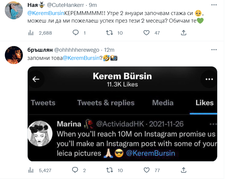 "Процесът на номиниране за младежки награди в Турция започна! Номинираме Керем Бюрсин в категорията "Най-добър актьор в сериал". Номинациите ще се правят само чрез приложението Turkey Youth Awards. Краен срок за номинации: 30 януари 2023 г."