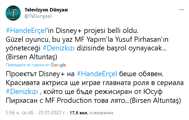 Бирсен Алтунташ е пуснала в обръщение тази новина за новият проект на Ханде, но аз ще си изчакам потвърждение от самата нея. Тя ще играе главна роля в сериала "Русалка", който ще започне да се заснема през лятото. Режисьор ще бъде Юсуф Пирхасан, който е бил режисьор и на "Почукай на вратата ми".