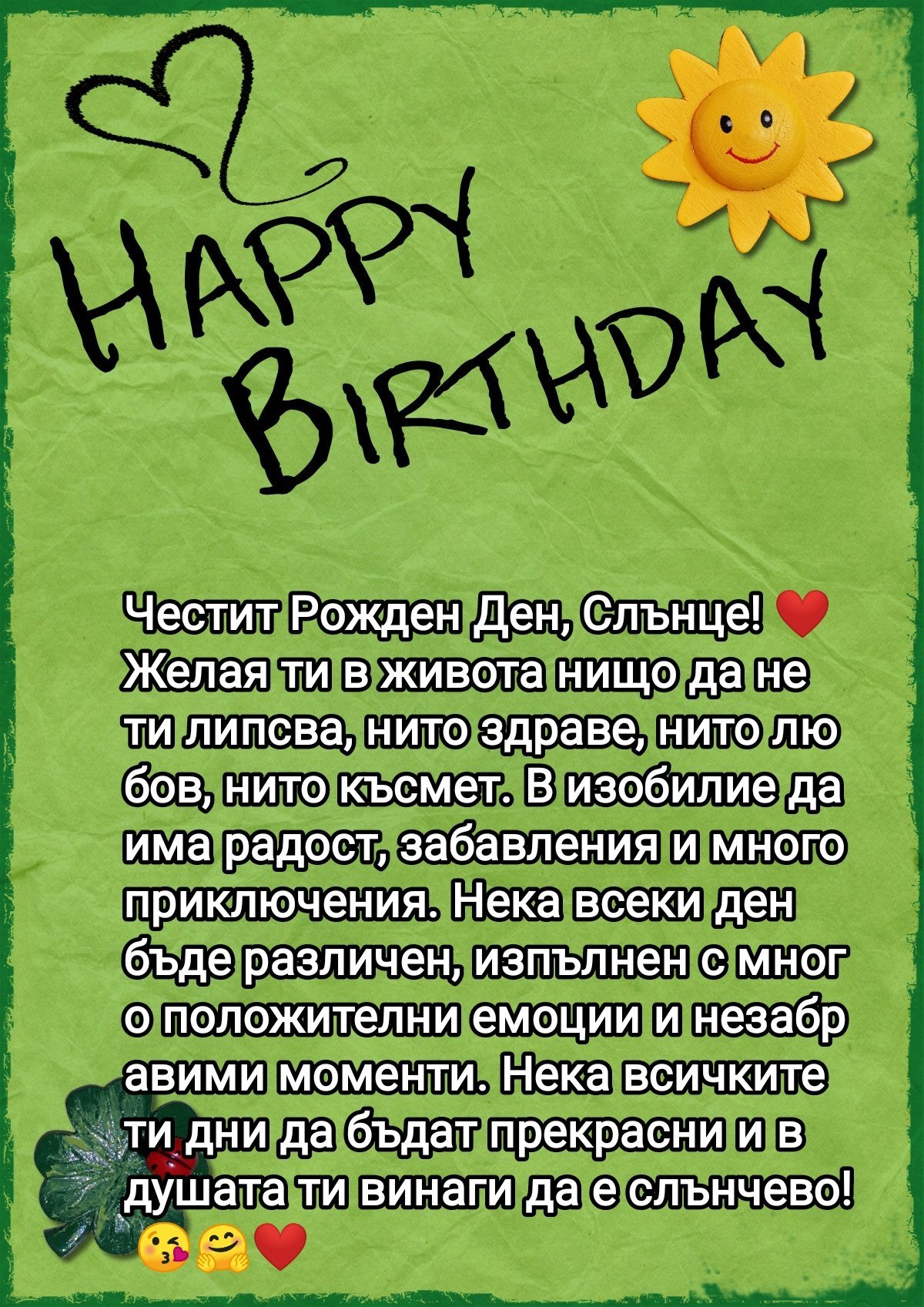 Честит рожден ден, Слънчице! Kissing Heart Пожелавам ти да си жива и здрава, много щастлива и обичана! Все така като истинско слънце да огряваш нашата тема! Да не ходиш по чужди къщи! Joy Ако ти стане скучно, винаги може да си заформим скандалче двете, на линия съм. Sunglasses