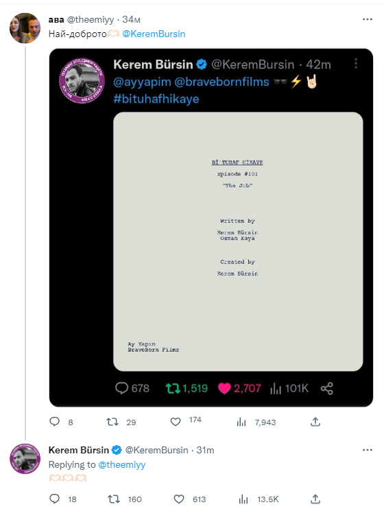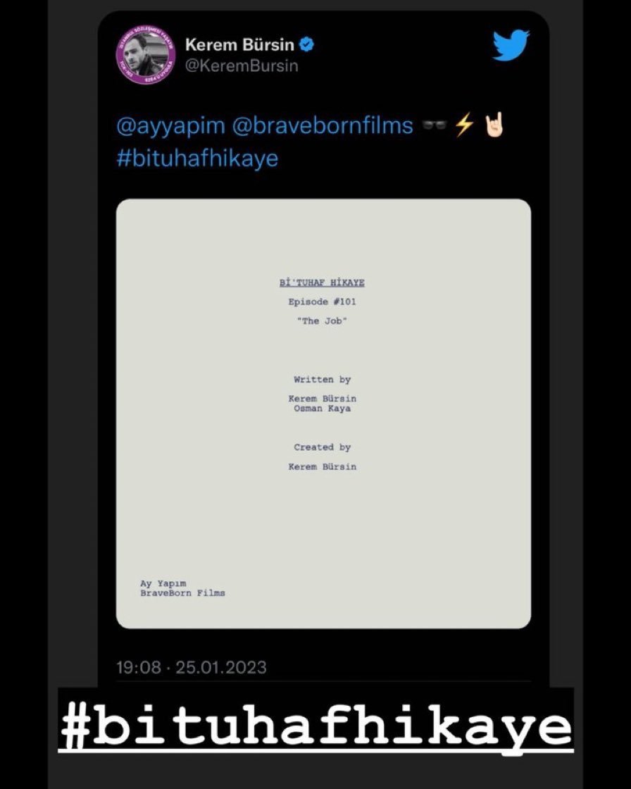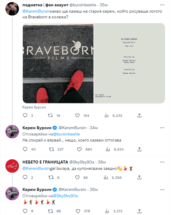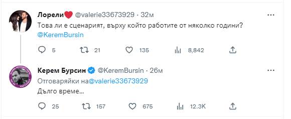 Много се радвам, че се оказахме прави , че този проект ще е по сценарий на Керем. Той ни даваше някакви малки следи, но ето вече е официално. Отдавна се знае, че Керем пише. Нямам търпение да разберем какво му се е въртяло в главата толкова години. Stuck Out Tongue Winking Eye