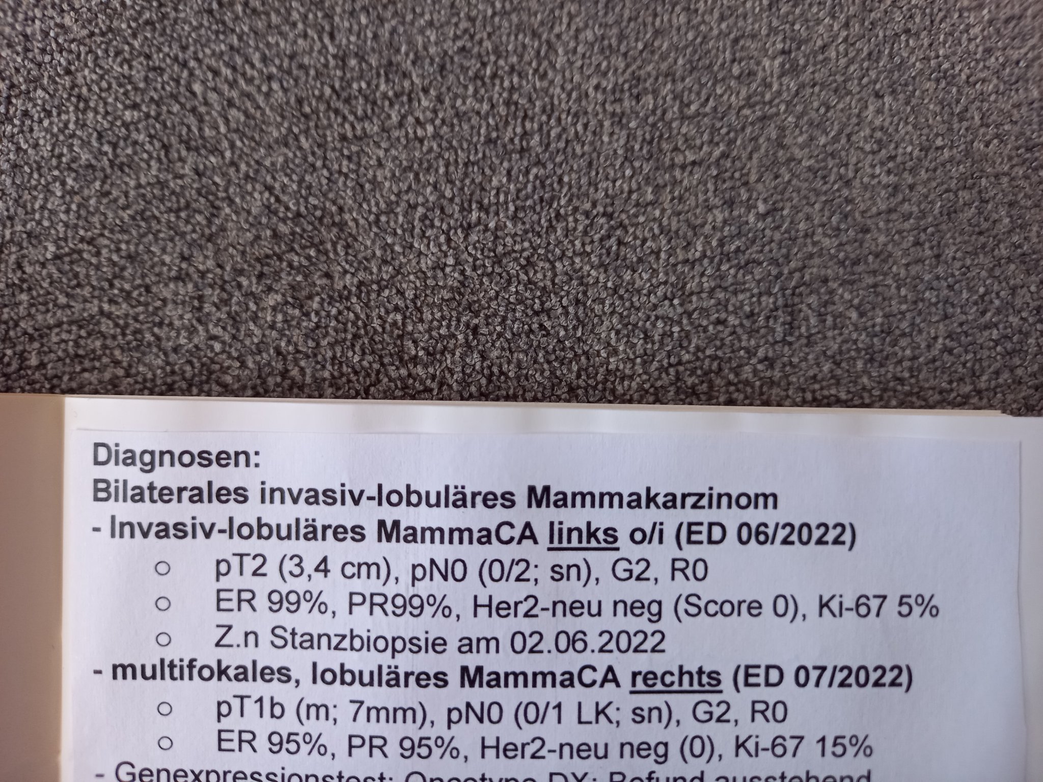 Диагнозата на рак на гърдата се поставя чрез система за стадиране, която включва букви като 'T' за размера на първичния тумор, 'N' за наличието на ракови клетки в близките лимфни възли и 'M' за далечни метастази. Освен това се използват други съкращения като 'G' за диференциация на тумора, 'R' за резекция, 'L' за инвазия в лимфните съдове и други.