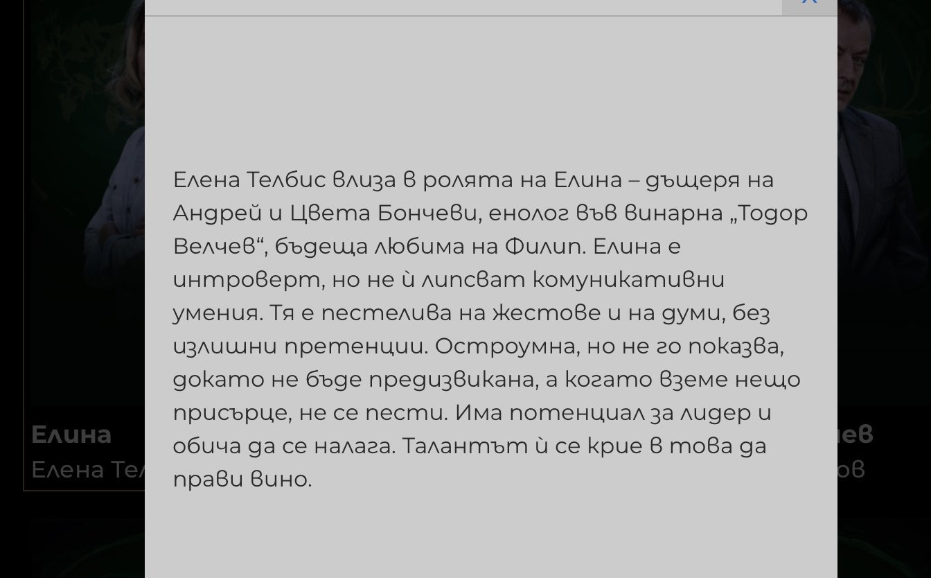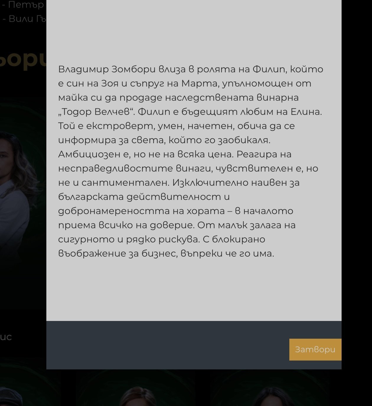 Марко и Катина заминават за Франция и там от Велчеви, стават... Вале.... Найс, а... Simple Smile Умират млади и семейната им история се затрива за френския клон, остава интереса към вината. Имат правнук - Кристоф, който се запознава с Елина и се сближават, защото той знае, че има български корени. Бончев обаче има вече интерес към винарната и затова пресича връзката на Елина с Кристоф, за да не почне да дълбае в семейната история и да разбере, че има права над винарната.
