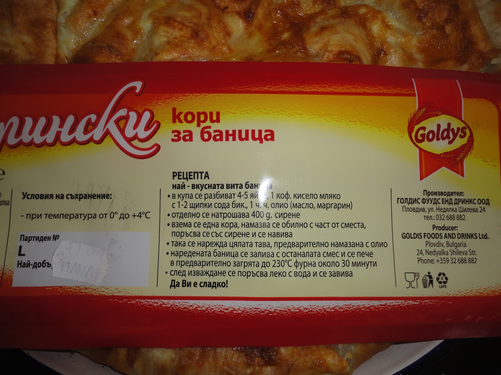 stenly, тази рецепта е от опаковката на българските "Одрински кори". Наименували са я  "най-вкусната вита баница" и наистина е такава. Предполагам, че имаш от оригиналните одрински кори, но тази рецепта е подходяща за всички видове дебели ръчно точени кори, които се продават, включително и тези "на сач". Единственото, което променям, е че я правя с 1 пак.бакпулвер, а не със сода. И не я завивам след изпичането, защото я предпочитаме хрупкава.
