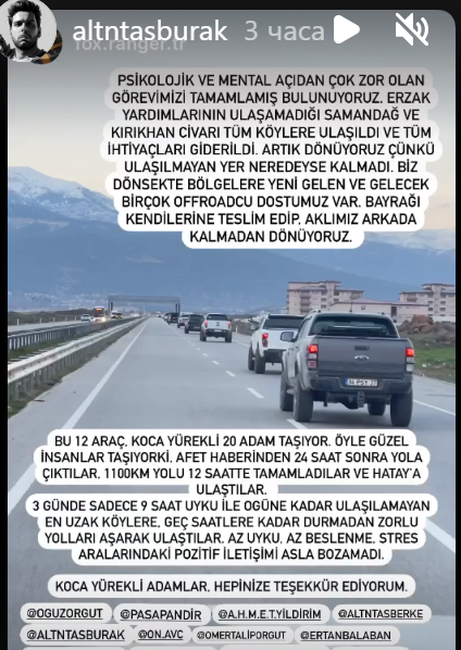 На тази снимка пише"Изпълнихме мисията си,която беше много трудна,психологическа и психическа.Всички села достигнахме до Самандаг и Кирихан, до които не можеха да бъдат доставени помощи.Сега се връщаме,но имаме много оффороадцус приятели,които идват и ние предаваме знамето и се връщаме .