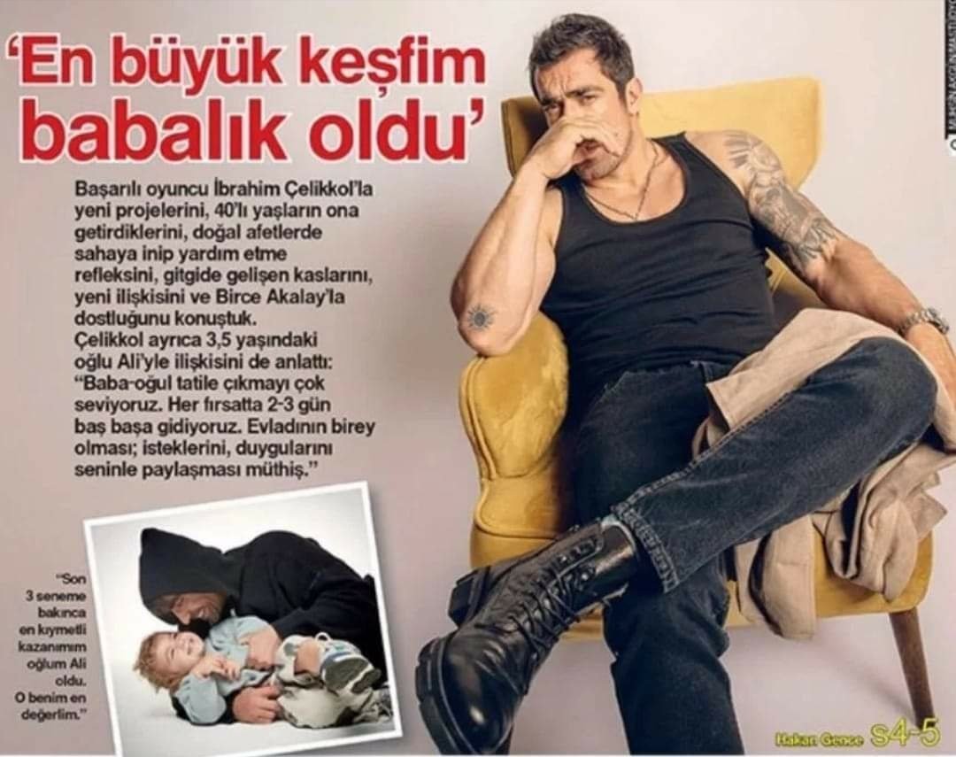 Говорихме с успешния актьор Ибрахим Челиккол. 3a новите му проекти, какво са му донесли 40-те години, инстинкта му да се втурне да помага в случаите на природни бедствия, за мускулите му, които нарастват, за новата му връзка, за приятелството му с Бирдже Акалай. Ибрахим Челиккол разказа за връзката си с 3,5 годишния си син Али: "Баща и син, обичаме да ходим на почивка. Ходим само двамата за по 2-3 дни при всеки повод."