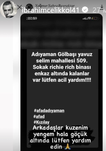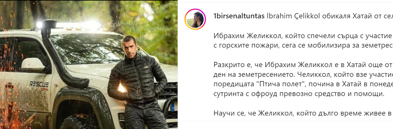 Журналистката Бирсен Алтънташ най-напосле отрази участието на Ибрахим в помощ на пострадалите.Това се случи,след като много фенове писаха в коментари в профила й,защо не отразява и Ибо.Тази журналистка си има свои любими актьори за които пише постоянно,но не и за Ибрахим и Бирдже.