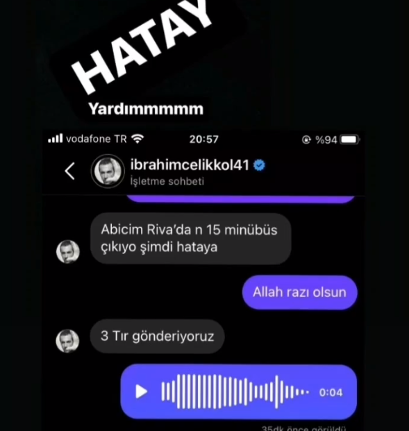 Ибрахим е огранизирал помощи за Хатай/Антакия ,че изпратил 15 мини буса,които сега излизат и изпраща  още 3 тира.Той му отговаря с  с Бог да те благослови.💯❤👏