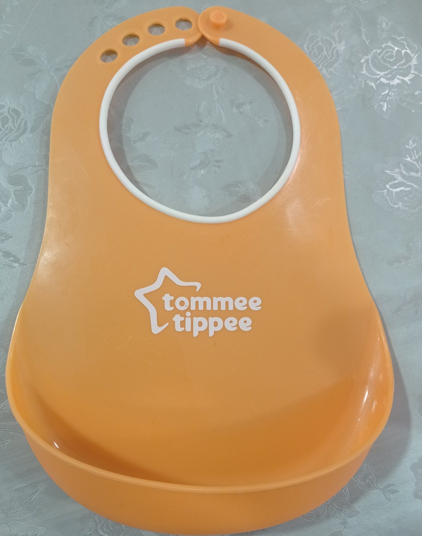 След няколко сменени лигавници сега се храним с този.Пластмасов ,на мен лично не ми харесва ,но по не се цапа.Доста е корав.Като се накапе бършеш и толкоз.Почти не се цапат дрехите ,като почнат да сядат сигурно ще е по удобен.