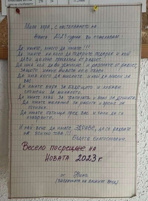 Писмото на една обикновена чистачка от бургаския ж. к. „Славейков“ развълнува мрежата през последния ден на 2022 г.