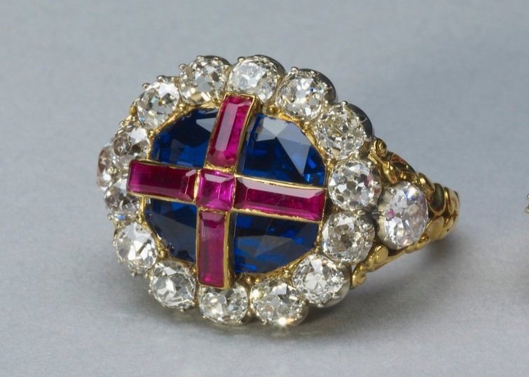 Съставен от диаманти, рубини и сапфири в златна обстановка, рубинът е основният камък на пръстена от 13ᵗʰ век.