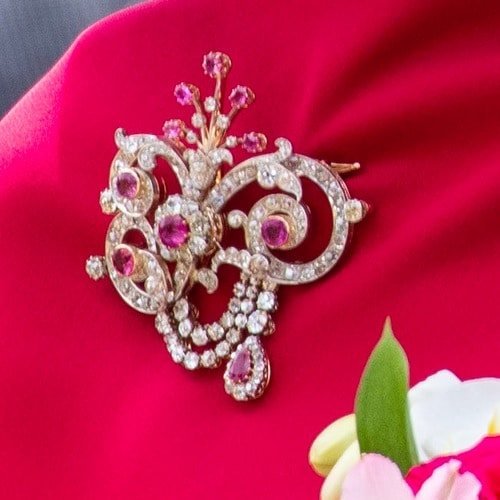 Máxima носи брошка с диаманти и рубини на роклята си. Историята на бижуто датира от 1897 г. През тази година е поръчана парюра за кралица Вилхелмина от франкфуртския бижутер E. Schürmann. В допълнение към диадемата към комплекта принадлежат и огърлица и devant de corsage (накит на гърдите). След посещението на Джулиана в САЩ, бижутата на гърдите бяха демонтирани за нова брошка, която Максима носи днес