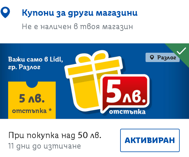 За Лидл Разлог, купон за 5 лв. при покупка над 50 лв.