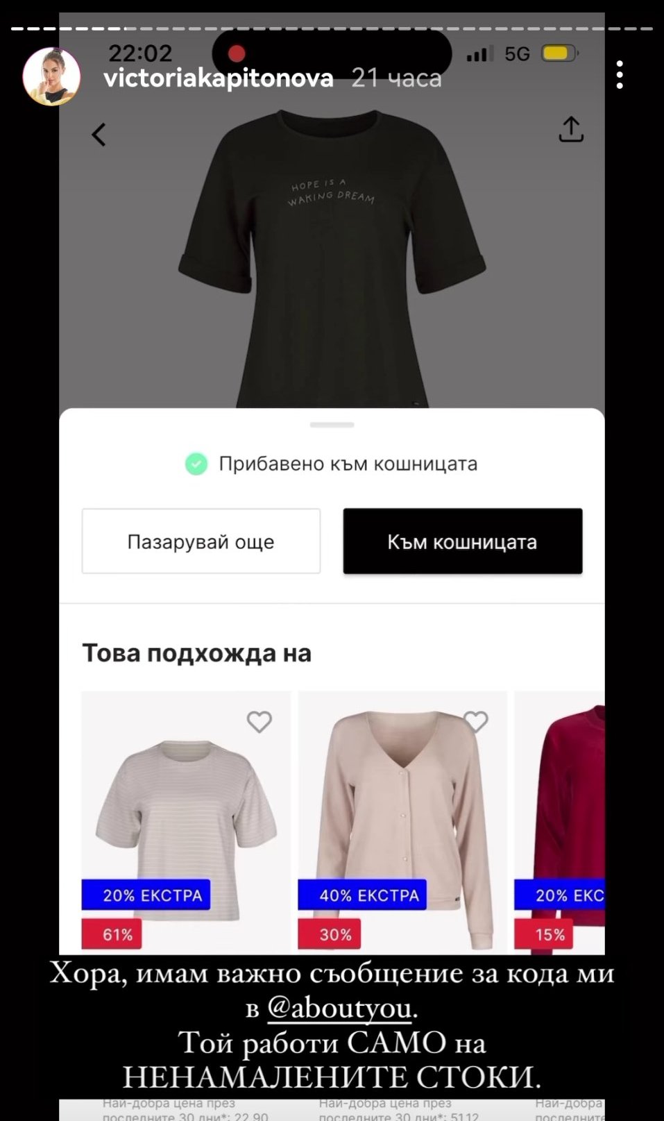 За да върнете продукт към AboutYou, трябва да използвате документа за връщане, който се намира в пратката, и стикер с товарителница. Можете да използвате оригиналната опаковка или кутия, която сте получили с продукта. След като поставите артикулите, документа за връщане и залепите етикета (товарителницата) върху кутията или плика, можете да вземете пратката до офис на Еконт или да поръчате вземане от вашия адрес чрез обаждане на телефон 07001 7300. За да върнете продукт от уебсайта на About You, залепете етикета за връщане върху оригиналната опаковка и го оставете в офис на Еконт. Можете също така да изпратите пакета с етикета за връщане до офис, въпреки че етикетът показва "Econtomaat".