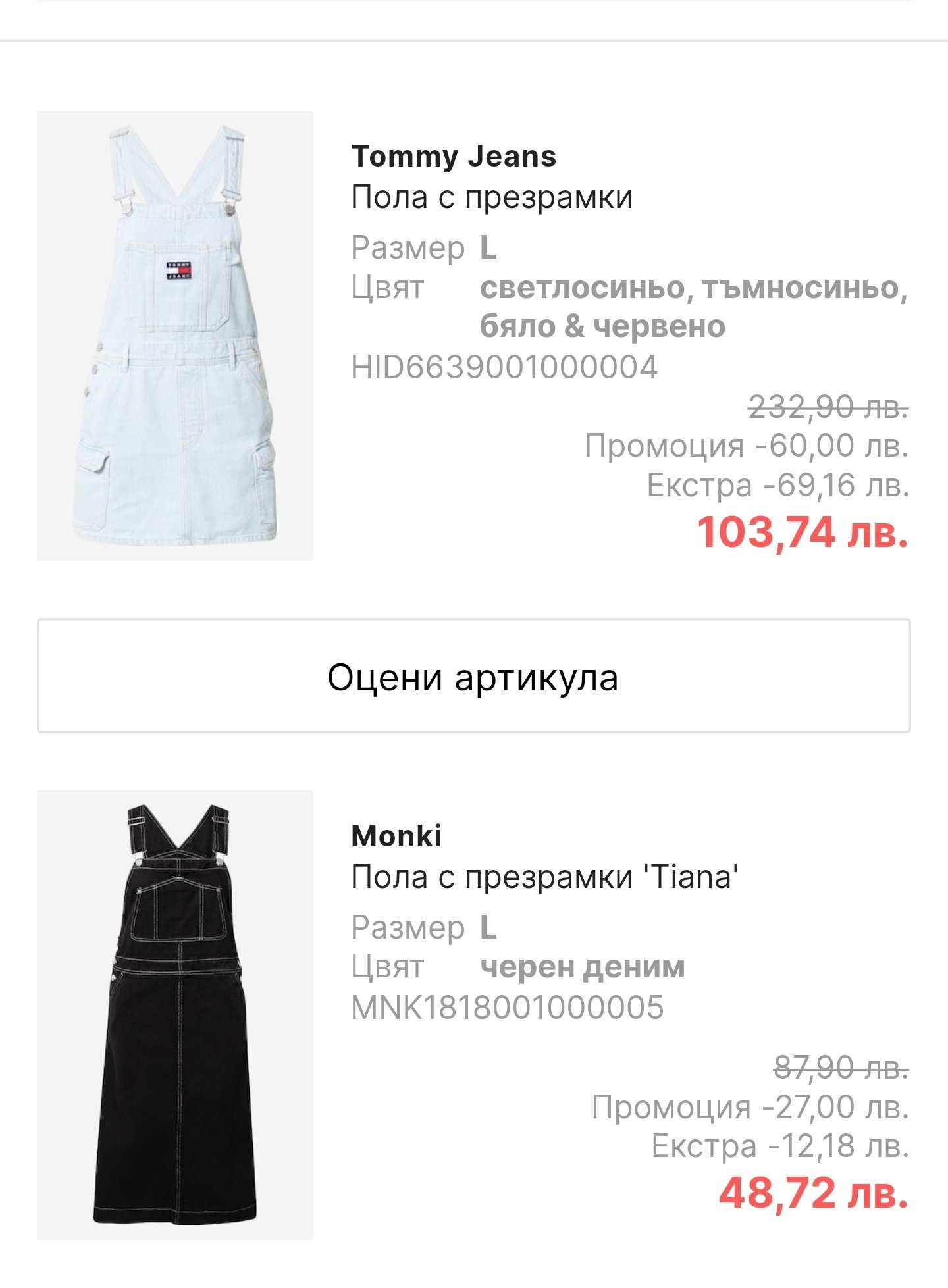 Гащеризонът на Хилфигер за съжаление не ми става, малък ми е. Очаквах да е уголемен, но уви. Плътен е и е много къс. Ще го връщам. На Монки гащеризонът ми е ок, но много дълъг, а аз съм ниска, доста плътен. Чакам и в синьо XL и ще преценя кое ми харесва повече и дали да ги оставя.