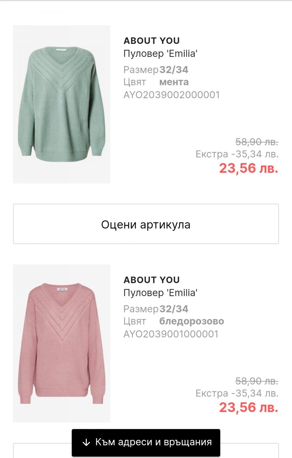 Тези пуловери няма как да са по-далеч от истината откъм цвят. Въобще не са така светли, розовия е много тъмен, към Бордо, но розовее, а другия не е мента, а отива към маслина. Ако някой му харесват да пише на ЛС преди да съм ги върнала, просто не са моите цветове, а си имам много пуловери не искам да заседяват в гардероба.