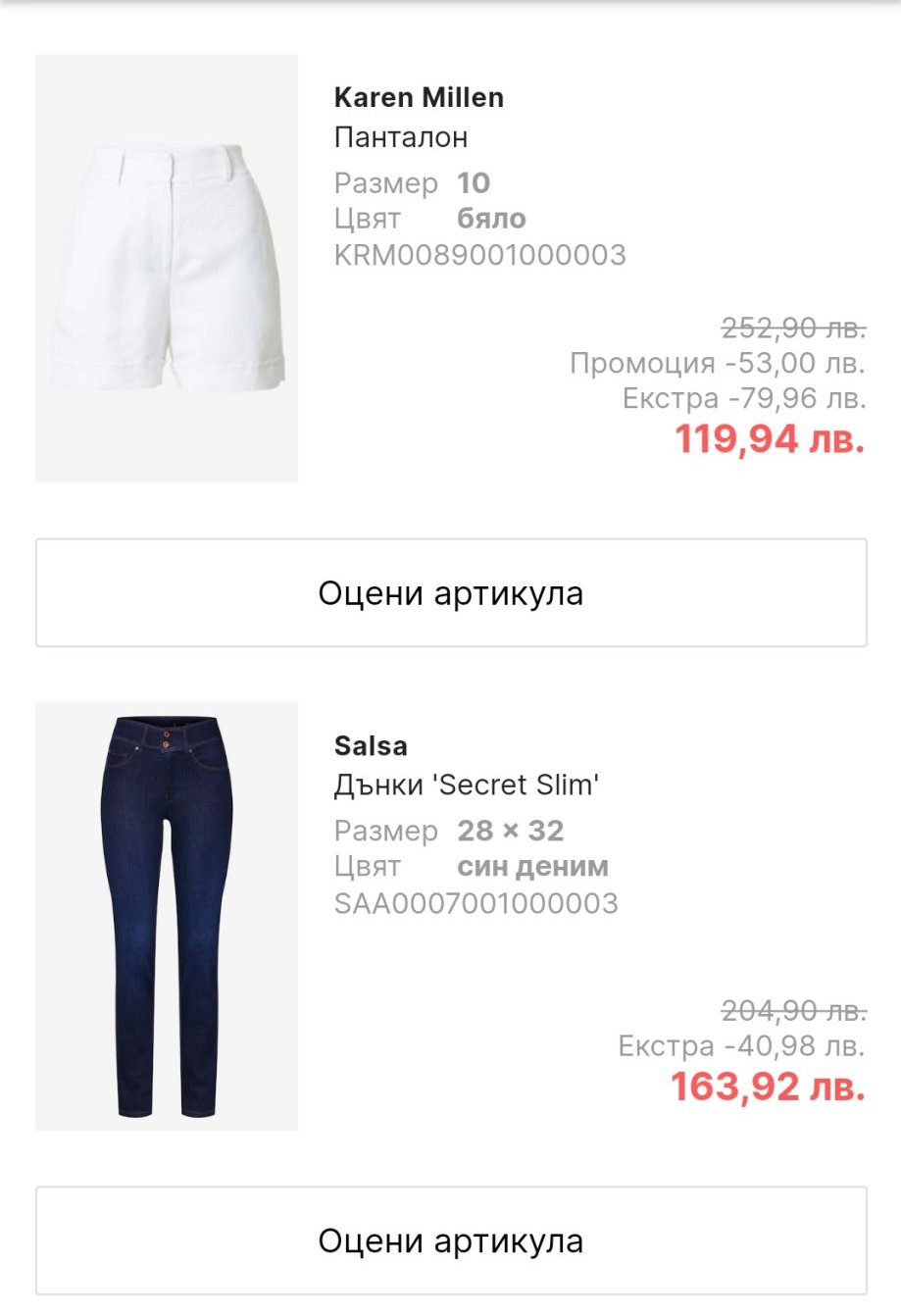 Поръчах си тези два панталона, но за съжаление не са моята кройка. В талията са ми широки, а ако поръчам по-малък размер, в бедрата няма да ми станат. За капак и на дължина ми идват до около средата на прасците.