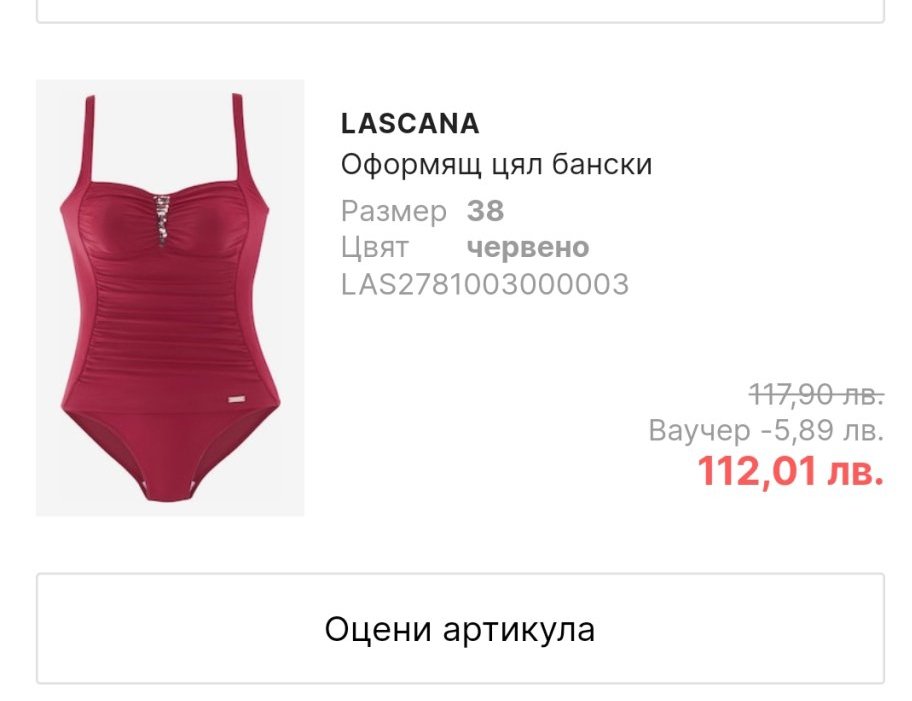 Някой питаше за банските на Lascana. Сетих се, че преди година си взех този. Реално не съм го вкарала в употреба, защото просто не харесвам цели бански и не ги намирам за практични. Един господ знае защо не го върнах... Иначе кройката е хубава, стои стегнато и красиво, отговаря си на размера (всъщност сигурно е сравнително удължен, защото съм висока 180см, а не опъвам презрамките твърде много). Иначе за бански костюми препоръчвам s'Oliver - сега бях на море и  изкарах почивката с няколко на марката и съм изключително доволна - еластични, съхнат бързо, стоят добре. Дори при плуване не ожулват кожата (имала съм случаи при по-активно движение във водата други бански да ми охлузят кожата около гърдите до кръв от търкането).