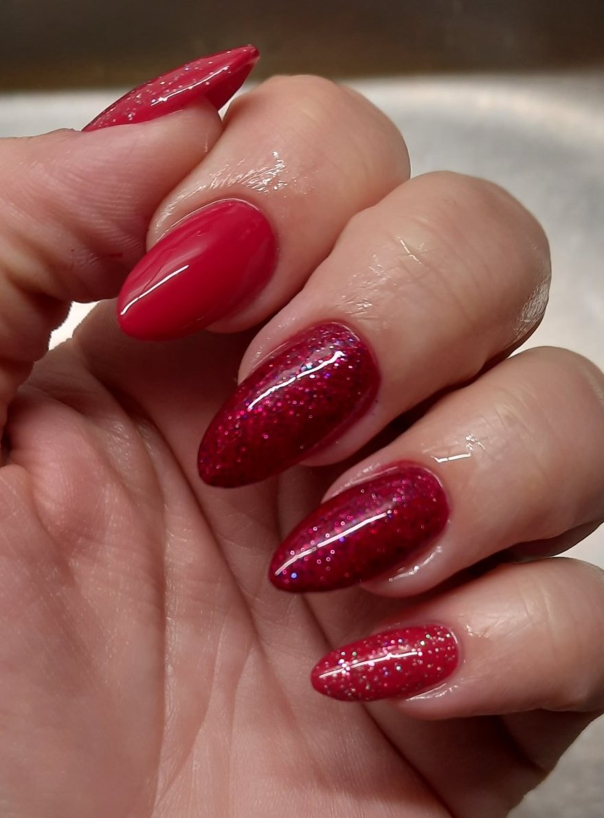 На 06.01. подрязах част от изградените с гел нокти, а после реших отрязаните да ги изградя с горни форми с полигела, който имам, а останалите изпилих до тънък пласт и отгоре директно с четката нанасях полигел. Може и да не е с консистенция на истински полигел, обаче поне засега всичко, изградено с него, ми е здраво и не съм имала нацепване, счупване и т.н  А прозрачно-розовият ми твърд гел за изграждане определено не е толкова здрав, колкото прозрачният вариант. Беше си мъчение с този полигел, времеемко (формите много се разместваха и кривяха, наложи се няколко пъти да пиля всичко и да почвам отново, но все пак не може да ходя с криви нокти😄). Самото печене, дори и нокът по нокът, беше бързо. На няколко места се получиха повърхностни балончета с въздух, та после изпилих леко и ги запълних и тях с полигел. Някои от ноктите, изградени с гел предишния път, имаха цепнатини отляво и отдясно на израсналата част, затова запълних и цепнатините с полигел. Накрая върху полигела направих и малко изравняване с топ лака (формите, които имам, ми изглеждаха леко плоски).