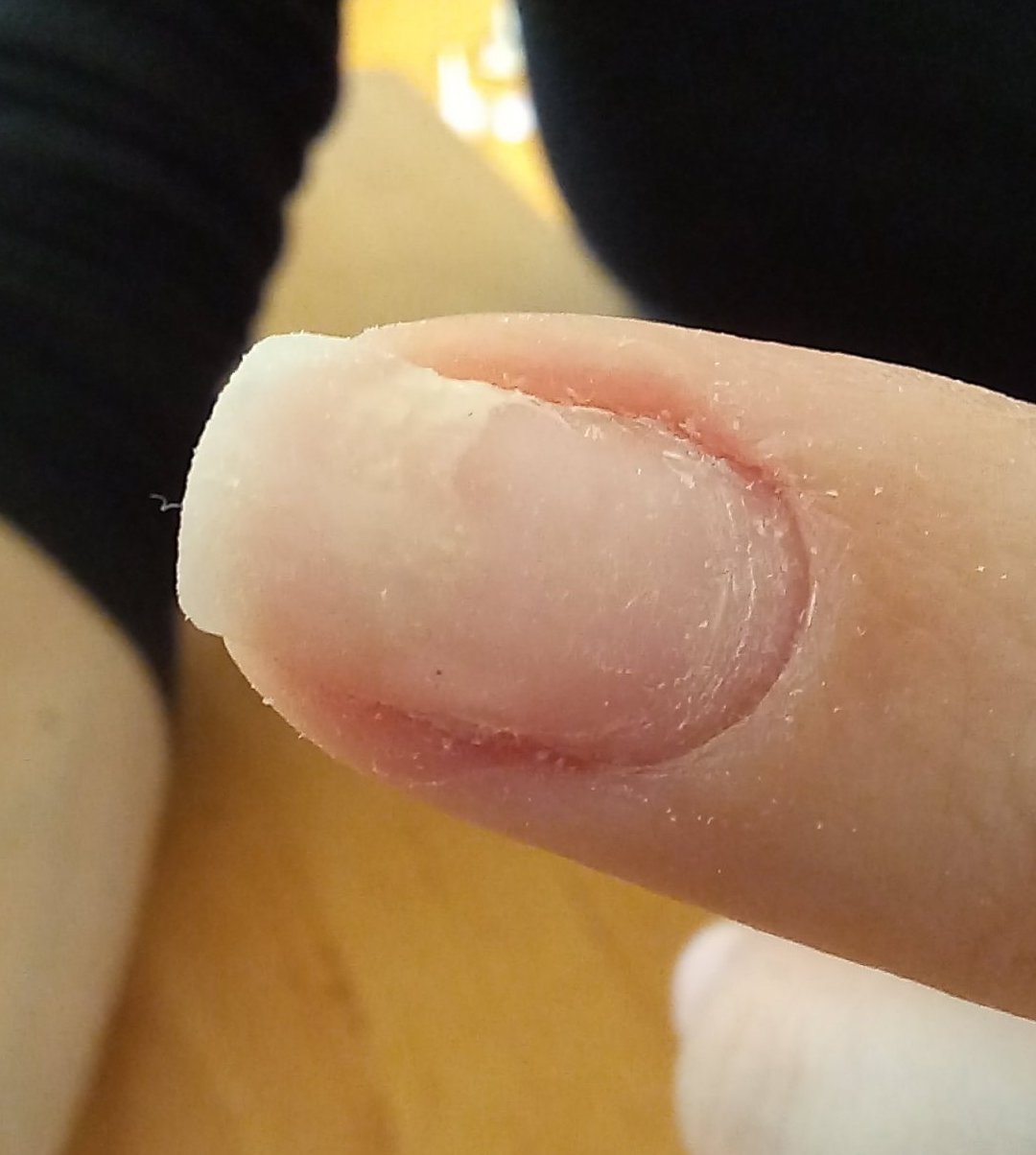 Не знам дали се вижда добре на снимката, но нокътя ми е отлепен. Не е отлепена базата от нокътя, а нокътя от нокътното легло. Ударен е, по-скоро силно огънат преди 2 месеца някъде, тогава ми бяха доста по-дълги ноктите. Оттогава си седи така с "балон", но сега е доста поизрастнал и го чакам вече да се счупи. Ще мисля как ще е подходящо да го възстановя/изградя, когато падне.