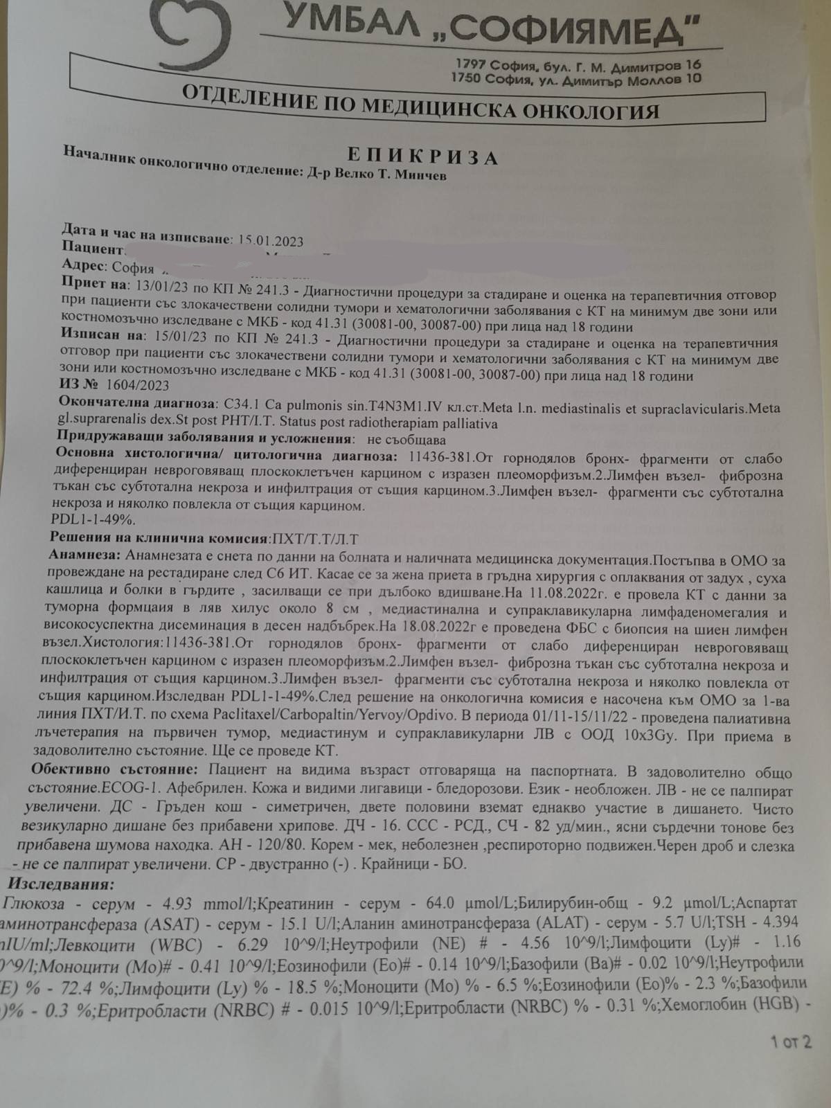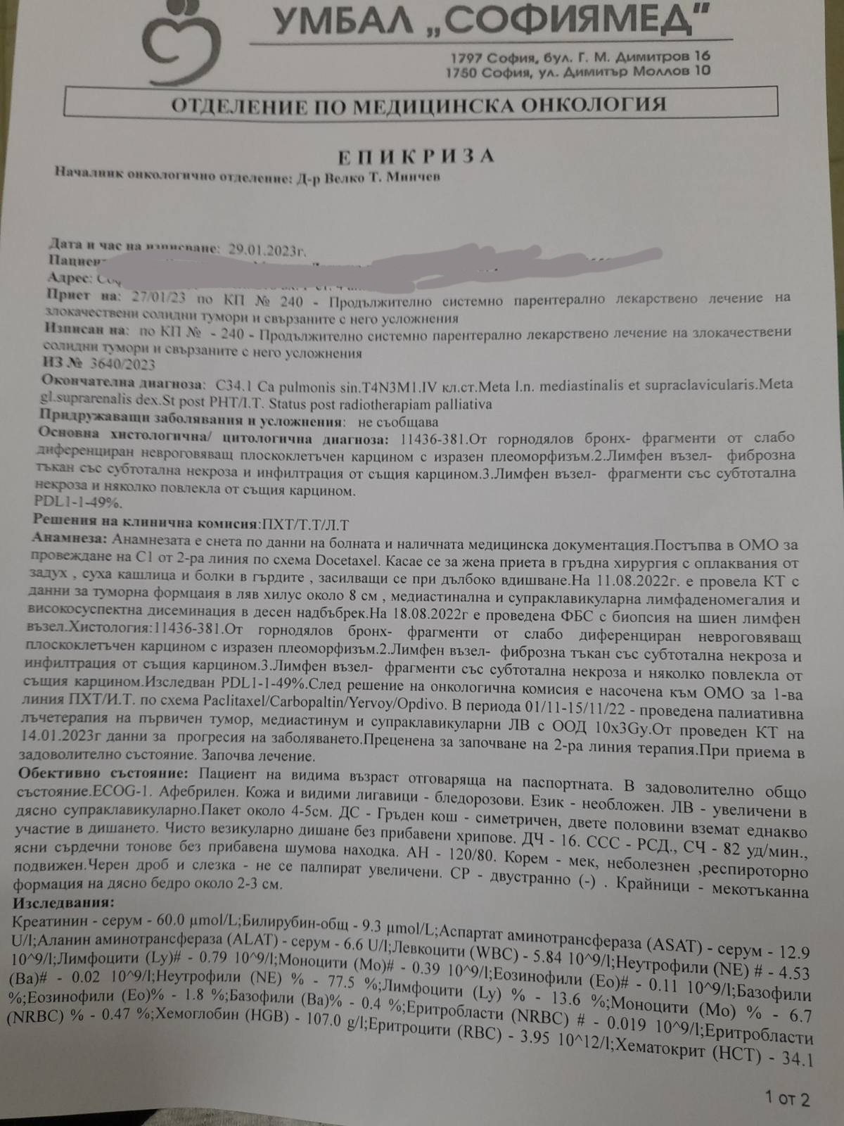 08.22г след задух при ежедневни дейности следва прием в гръдна хирургия Софиямед за бронхоскопия. Установен със скенер е тумор на белия дроб 9см и разсейки по лимфи(възли) и надбъбречна жлеза и плеврален излив, взета биопсия от лимфен възел на шията и бронхоскопия в Софиямед. Отпушиха й горния ляв бронх от метастазии във ВМА и има подобрение в задъхването. Има протокол от онкокомисия в Софиямед за таргетна, химио и лъчетерапия Paclitaxel/Carbopaltim/Yervoy/Opdivo. След 3 курса химио се чувстваше доста зле с всички странични ефекти. Стана кожа и кости. Каза, че доктора е казал, да спре химиото и е достатъчна, което малко ме съмнява, тъй като държи сама да ходи на прегледите и нямам информация от лекар. Лимфния възел на врата, от който взеха биопсия се увеличи доста и стана с размерите на 1 шепа. След направена лъчетерапия се смали с 1/3. Изпитва болки освен в мускулите и в стави и кости. Пие ОКИ, но то помага само за мускулните такива. След скенер на 13.01 се установяват: