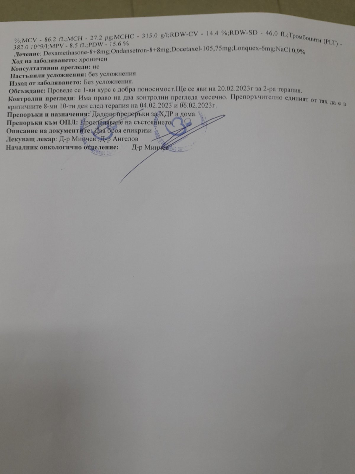 Тъй като отчитат прогресия следва да подлежи на нова линия терапия по схема Docetaxel. Утре са я насочили да отиде в Дървеница за сцинтиграфски изследвания на костите.