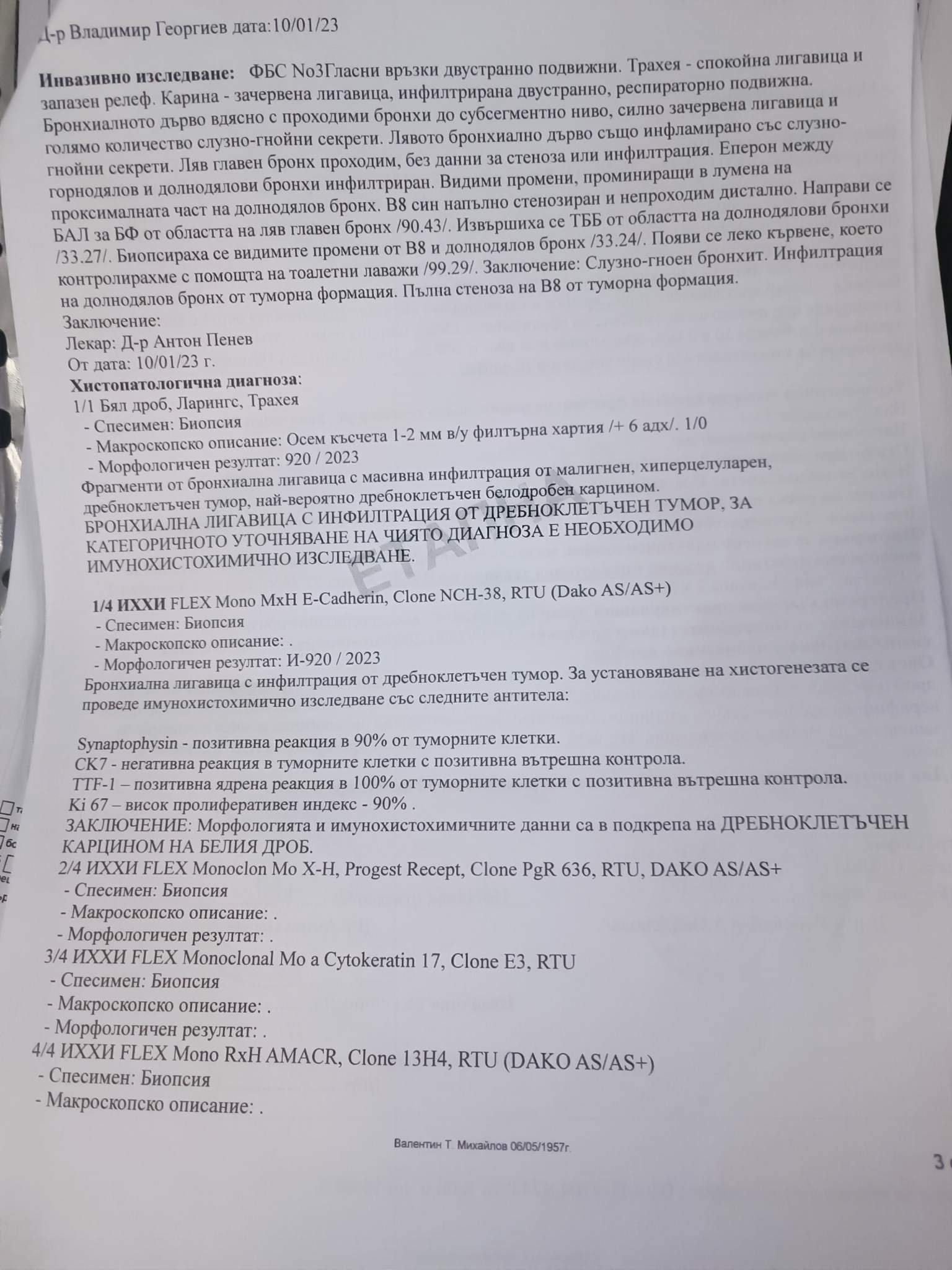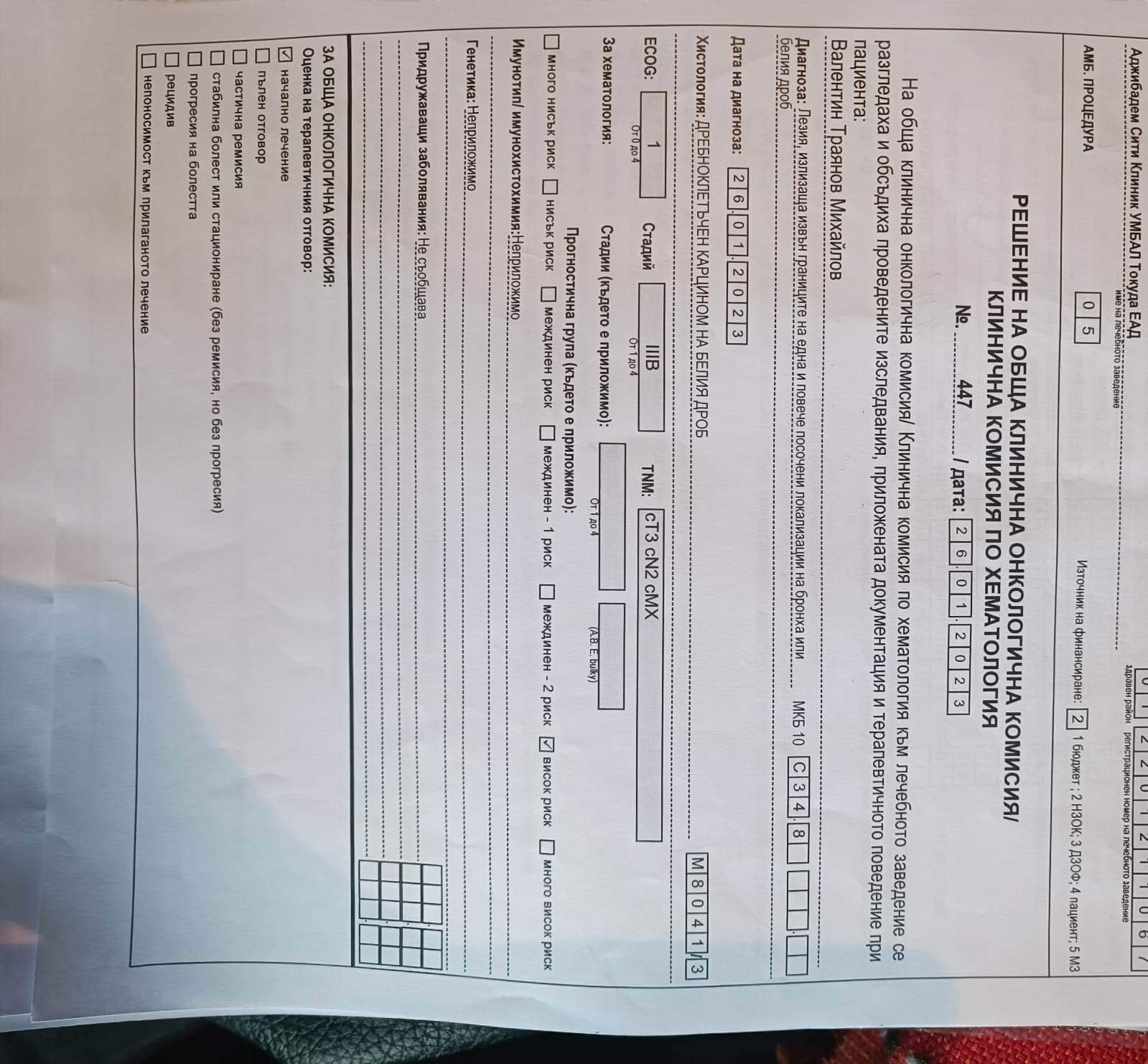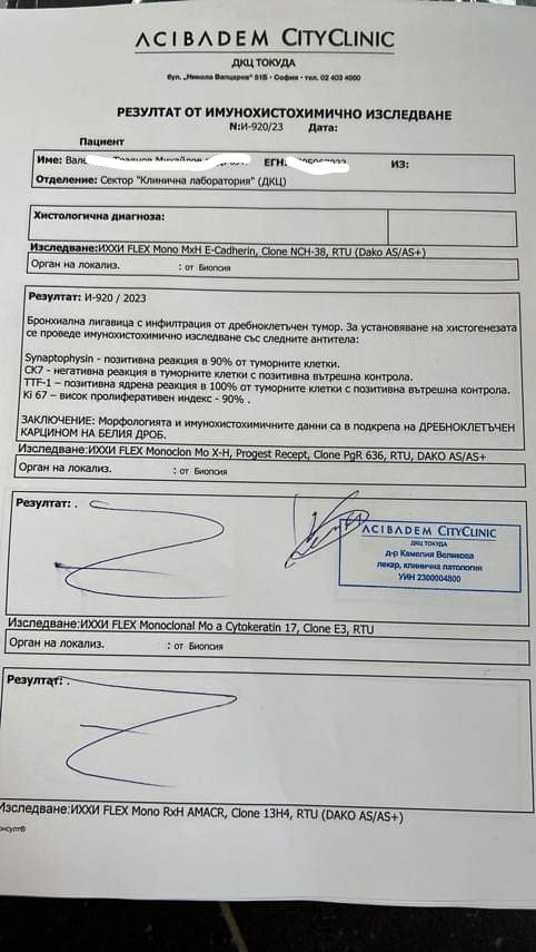 Здравейте, след прекарана пневмония в следствие на грип А, подвърдиха диагноза- дребноклетъчен карцином на белия дроб на баща ми в Токуда. В момента  казват, че не може да започне химио и лъчетерапия защото откриха и тромбоза. Той е с три байпаса, което още повече затруднява лечението. Относно  тромбозата(аневризма в белия дроб) тази седмица ще се решава ще издържи ли операция за отстраняването и. Вчера е направена онлайн консултация с К.Тимчева, която каза че нещата изглеждат зле,  не може да започне лечение веднага, а губиме ценно време. Можете ли да ми кажете какво означава стадия който е определен(прикачвам изследванията)?Въртим се в един омагьосан кръг и се опасяваме че закъсняваме с лечението.Сестра ми е говорила с онколог, който казва че на онкокомисията в Токуда не са представени придружаващи заболявания, и едва ли не претупват пациента понеже е със  много придружаващи заболявания и го отписват.Пет скенер трябва да се направи, но отказват заради тромбозата.Огледани са черен дроб, стомах, няма разсейки там, но вчера Тимчева каза, че трябва да се проверят надбъбречните жлези.Извинявам се за хаотичното обяснение. Може ли да е объркан резултата, какво ви е мнението?Лекаря с който сестра ми е говорила, обяснил че са взели в предвид увеличените лимфни възли, но те можели да са увеличени и от пневмонията и грипа и има много малка вероятност да е сгрешен резултата.Възможно ли е?Знам, че се хващаме като удавник за сламка, но много ни е трудно да приемем диагнозата.Той се чувства добре, почти не кашля вече, има апетит, няма загуба на тегло.Благодари ви от сърце  че ме изчетохте, ще се радвам ако ми дадете някакви насоки и изкажете мнение.Желая ви от все сърце здраве🍀