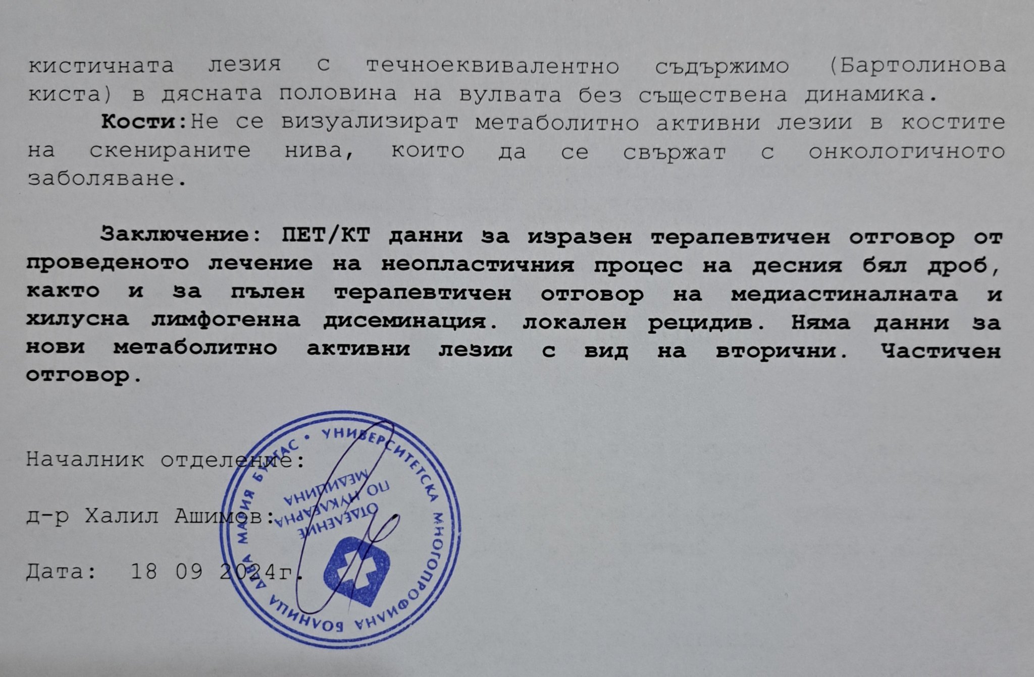 След операцията вероятно ще има ЛТ на туморното ложе и трябва да се смени системното лечение. На фона на ситуацията в главен мозък, мисля, че е редно да се направят образни на шия, торакс, абдомен и таз, ако такива не са правени скоро, за да се изясни и картината там.