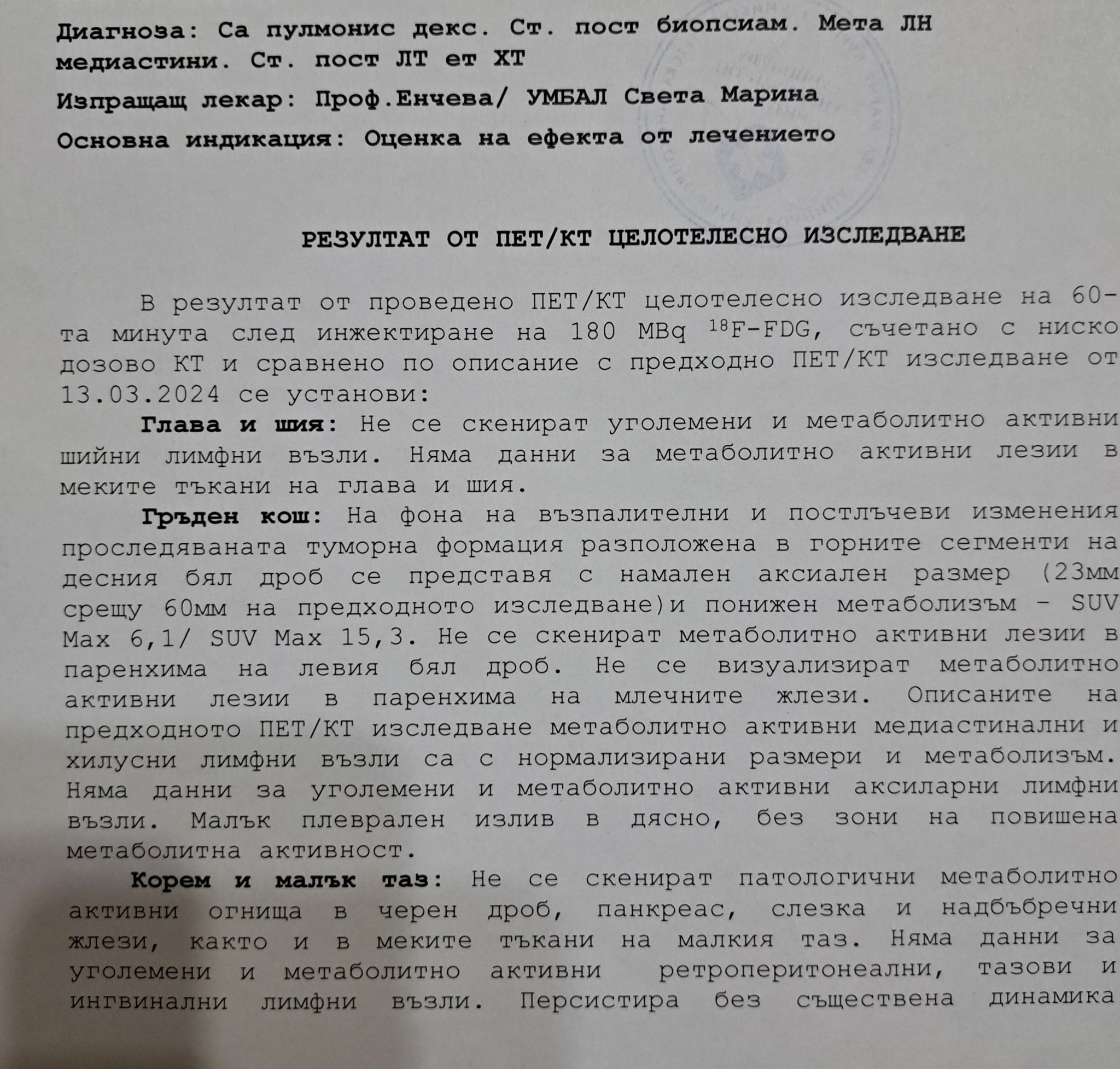 3-та линия ХТ с Доцетаксел с обяснението, че тя ще помогне за лечението на подутините по меките тъкани